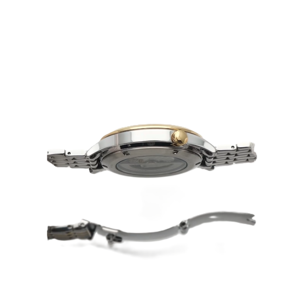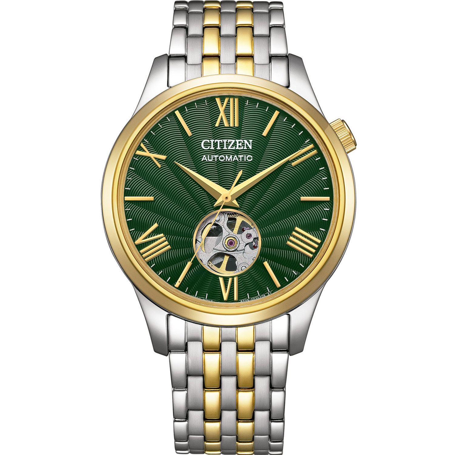 Мужские аналоговые механические часы с автоподзаводом. Коллекция Automatic. Основное достоинство часов с автоподзаводом состоит в том, что их не надо ежедневно заводить, т. к. в таких часах пружина заводного барабана получает энергию от вращающегося эксцентрика (ротора), который приходит в движение при любом изменении положения механизма. Если носить такие часы каждый день, подводить их вручную не нужно. Калибр механизма 8229. В механизме 21 рубиновый камень, частота 21600 полуколебаний в час. Запас хода не менее 40-ка часов. Центральные часовая, минутная и секундная стрелки золотистого цвета. Зелёный циферблат с открытым балансом хода. Часовые метки в виде золотистых штрихов и римских цифр. Круглый корпус из нержавеющей стали с IP покрытием цвета желтого золота на безеле. Диаметр корпуса 40 мм, толщина 10,7 мм. Устойчивое к возникновению царапин сапфировое стекло. Рифлёная переводная головка в позиции 2 ч. Стальной браслет с частичным IP покрытием цвета жёлтого золота, раскладывающаяся застежка. Прозрачная задняя крышка. Водонепроницаемость WR 50 (мытье рук, дождь). Вес около 130 г.