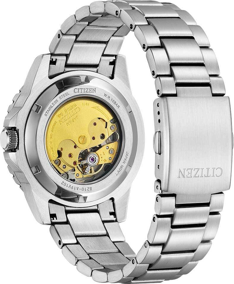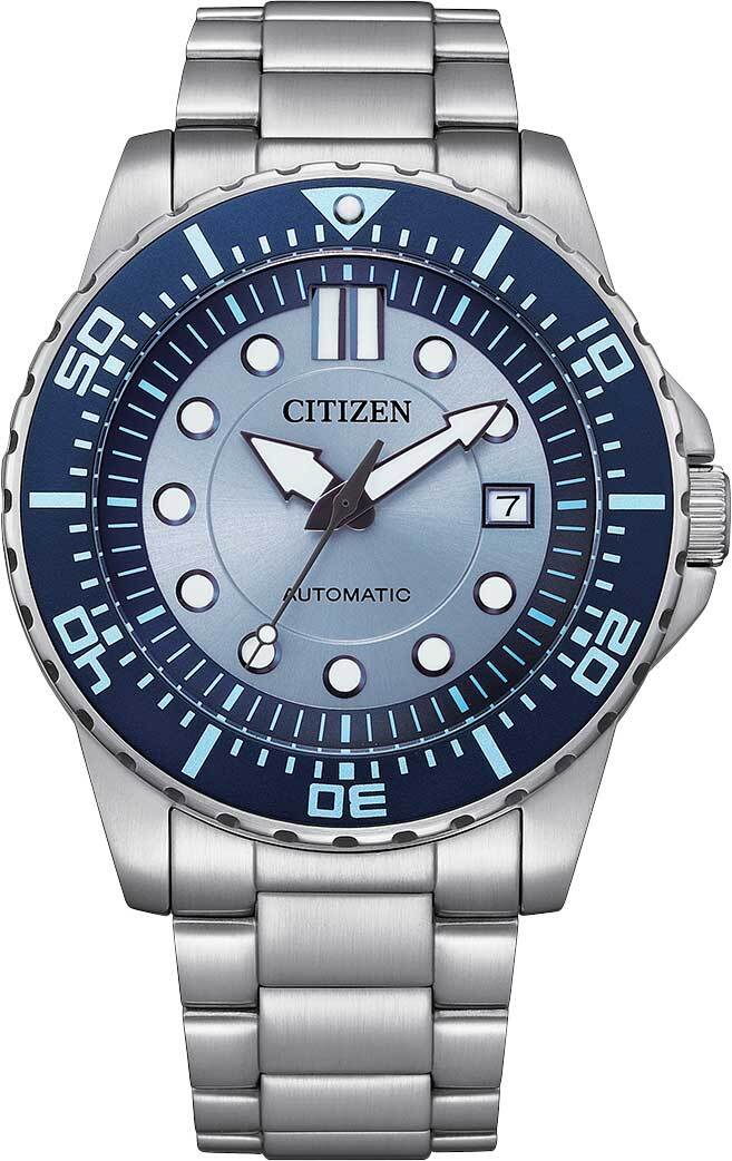 Мужские аналоговые механические наручные часы с автоподзаводом. Калибр механизма 8210 на 21 камне. Частота 21600 полуколебаний в час. Запас хода около 40 часов. Основное достоинство часов с автоподзаводом состоит в том, что их не надо ежедневно заводить, т. к. в таких часах пружина заводного барабана получает энергию от вращающегося эксцентрика (ротора), который приходит в движение при любом изменении положения механизма. Если носить такие часы каждый день, подводить их вручную не нужно. Центральные часовая, минутная и секундная стрелки. Апертура даты в позиции 3 часов. Голубой циферблат с часовыми метками в виде точек. На стрелки и часовые метки нанесено люминесцентное покрытие, которое светится в темноте после непродолжительного воздействия света. Круглый корпус из нержавеющей стали с покрытием синего цвета на безеле. Диаметр корпуса 43 мм, толщина 12.4 мм. Переводная головка с защитой в положении 3 ч . Стальной браслет, раскладывающаяся застежка. Прочное минеральное стекло устойчивое к мелким механическим повреждениям. Прозрачная задняя крышка. Однонаправленный поворотный безель. Водостойкость WR 100 (плавание без погружения). Вес примерно 182 г.