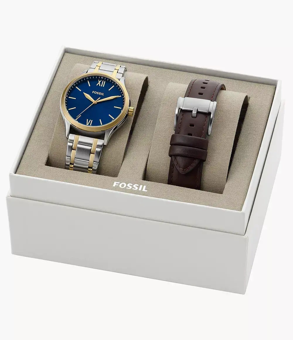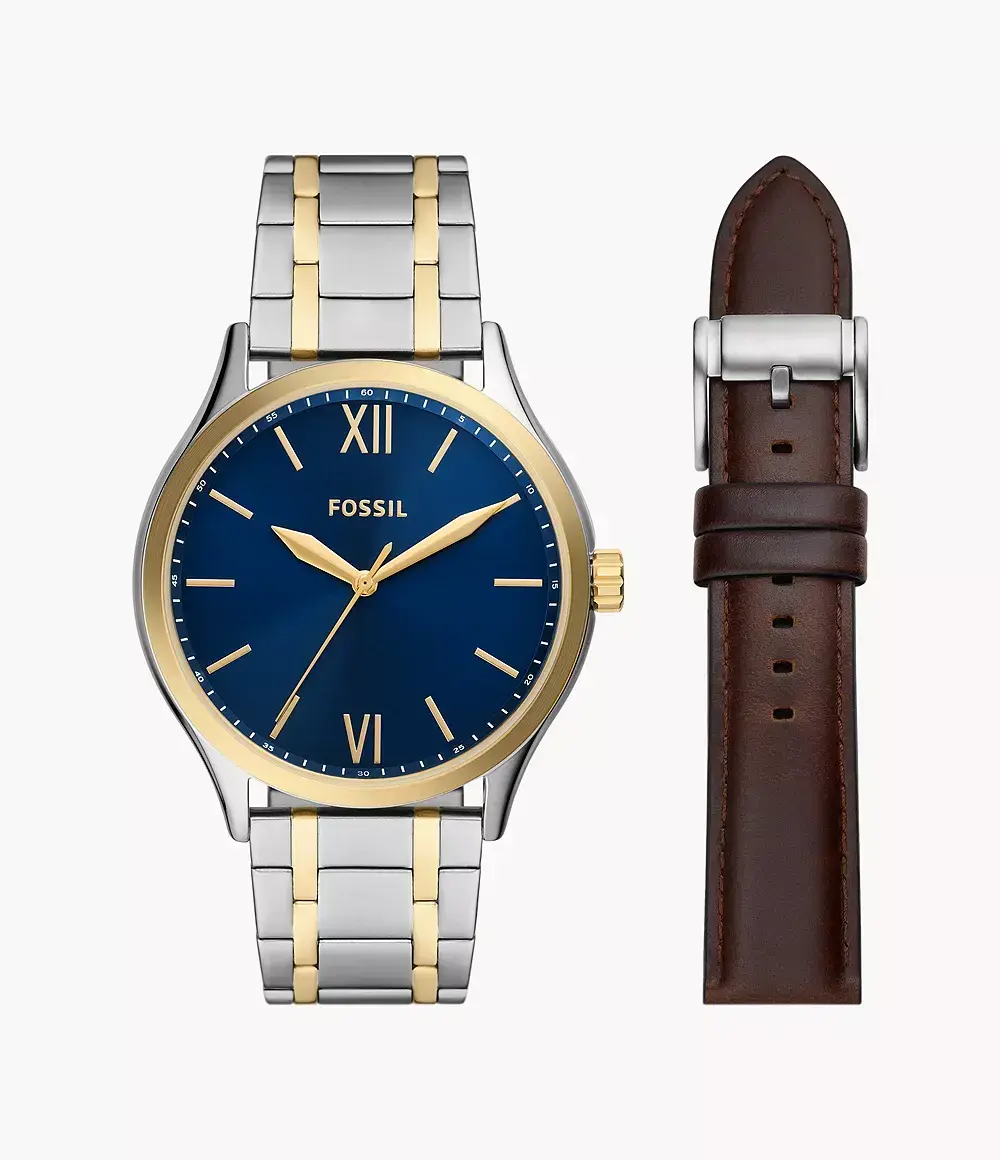 Мужские кварцевые аналоговые наручные часы. Коллекция Fenmore. Центральные часовая, минутная и секундная стрелки. Синий циферблат с часовыми метками в виде штрихов и двух римских цифр. Круглый корпус из нержавеющей стали с частичным покрытием цвета жёлтого золота. Диаметр корпуса 44 мм. Устойчивое к мелким механическим повреждениям минеральное стекло. Рифленая переводная головка. Стальной браслет с частичным покрытием цвета жёлтого золота, раскладывающаяся застёжка с 2 кнопками. В коплект входит дополнительный сменный коричневый кожаный ремешок с классической застёжкой buckle. Водозащита 50WR (мытьё рук, дождь).