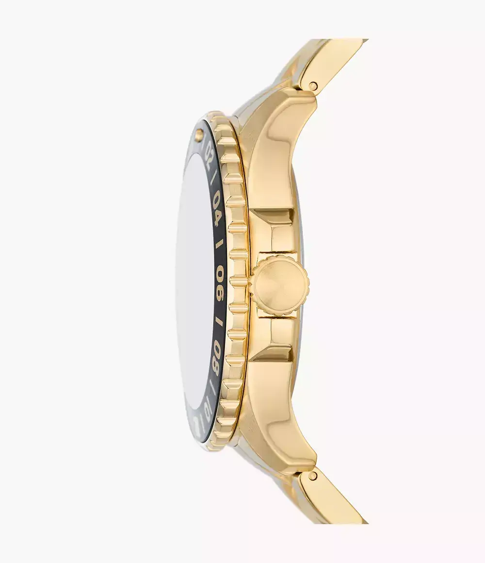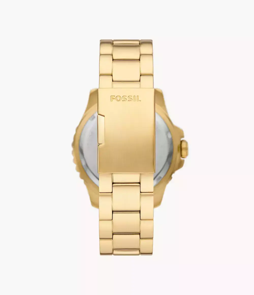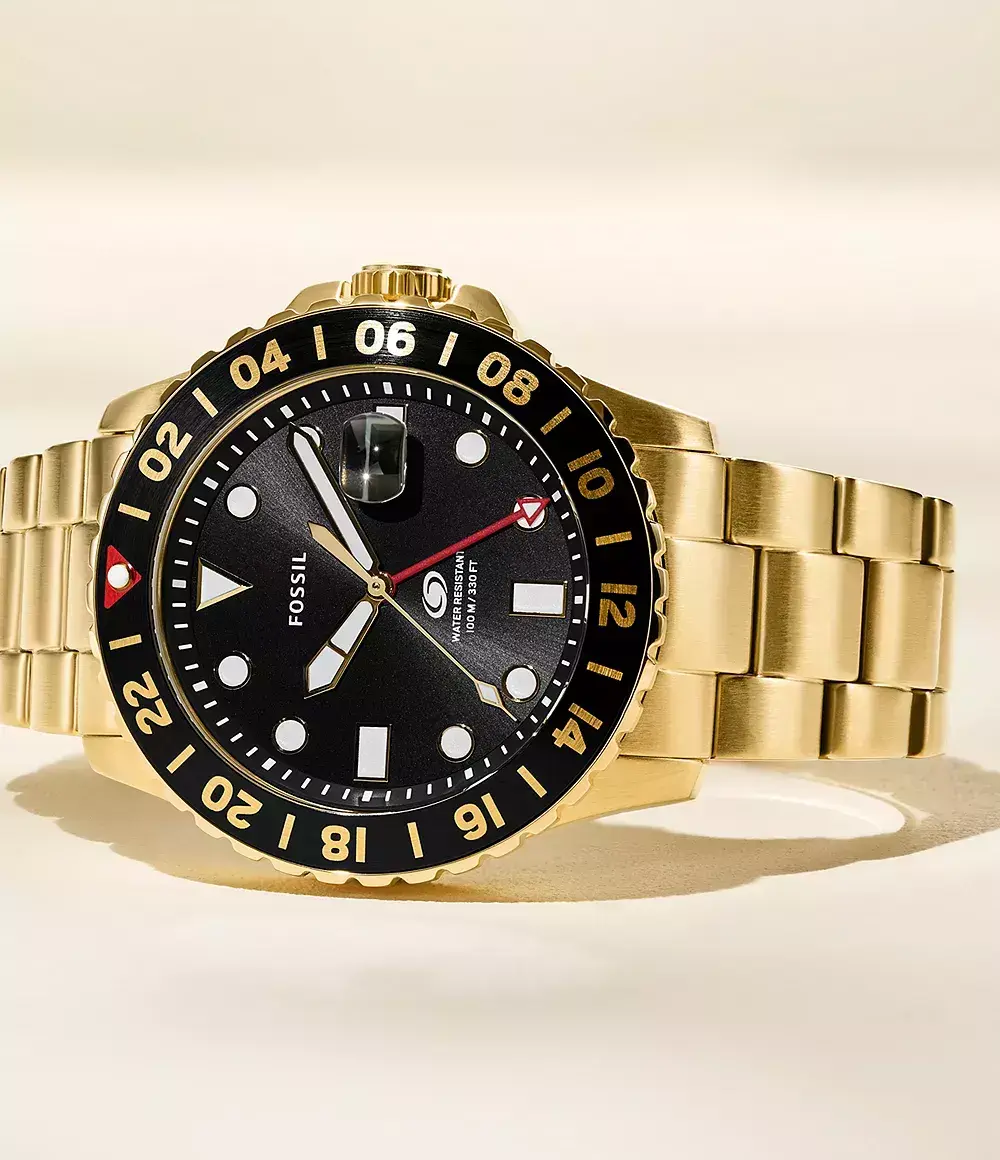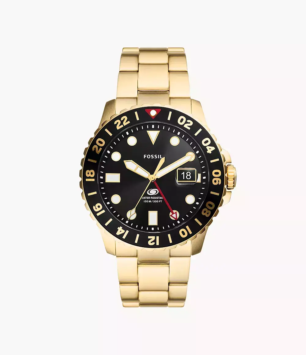 Мужские кварцевые аналоговые наручные часы. Коллекция Fossil Blue GMT. Центральные часовая, минутная и секундная стрелки. На стрелки нанесено люминесцентное покрытие (светятся в темноте после нахождения на свету). Индикация даты в положении 3 ч. GMT-стрелка (Greenwich Mean Time – среднее время по Гринвичу) — функция одновременного отображения времени в двух часовых поясах. Круглый корпус из нержавеющей стали с PVD-покрытием цвета жёлтого золота. Вращающаяся 24-часовая шкала Циферблат чёрного цвета. Диаметр корпуса 46 мм. Устойчивое к мелким механическим повреждениям минеральное стекло. Браслет из нержавеющей стали с PVD-покрытием цвета жёлтого золота с раскладывающейся застежкой с одной кнопкой.. Водостойкость WR 100 (плавание и ныряние без акваланга).