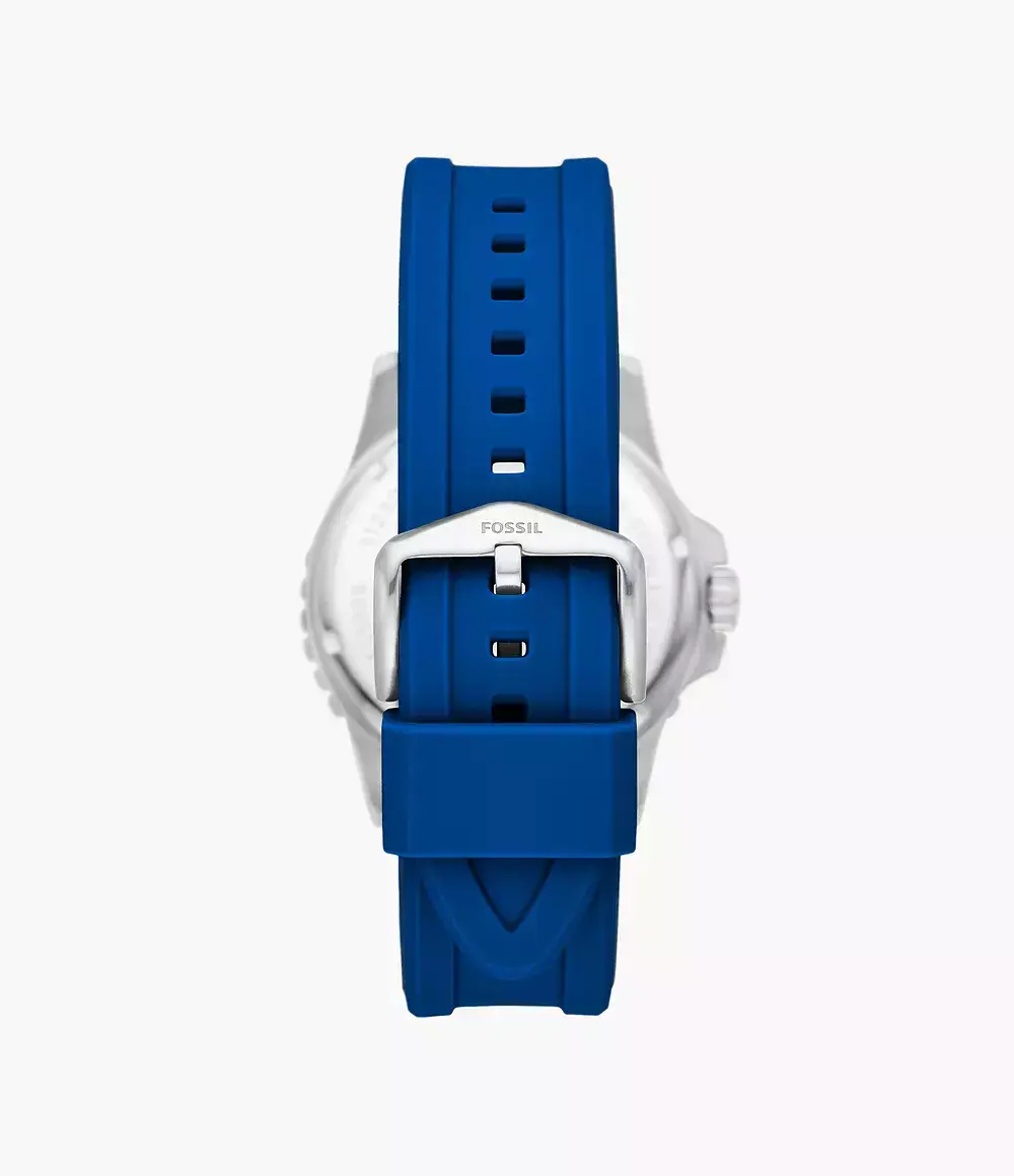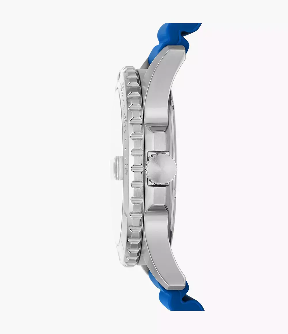 Мужские кварцевые аналоговые наручные часы. Коллекция Fossil Blue Dive. Центральные часовая, минутная и секундная стрелки. На стрелки нанесено люминесцентное покрытие (светятся в темноте после нахождения на свету). Индикация даты в положении 3 ч. Круглый корпус из нержавеющей стали. Циферблат синего цвета. Диаметр корпуса 42 мм. Устойчивое к мелким механическим повреждениям минеральное стекло. Пластиковый ремешок синего цвета со стандартной застёжкой. Водостойкость WR 100 (плавание и ныряние без акваланга).