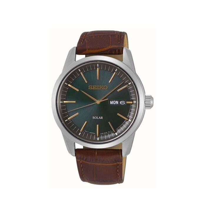 Кварцевые часы. Солнечная батарея. Время работы без подзарядки до 10 месяцев. Водостойкость WR 100. Центральные часовая, минутная и секундная стрелки. Индикация даты и дня недели на позиции трех часов. Черный циферблат с часовыми индексами в виде штрихов. Корпус выполнен из нержавеющей стали. Диаметр корпуса 40 мм, толщина 10 мм. Устойчивое к мелким механическим повреждениям сапфировое стекло. Кожаный ремешок коричневого цвета. Классическая застежка.