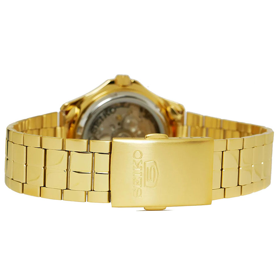 Мужские аналоговые наручные часы механические с автоподзаводом. Коллекции Automatic Seiko 5. Калибр механизма 7S26 (21 камень в механизме, 21 600 полуколебаний в час). Запас хода около 40-ка часов. Основное достоинство часов с автоподзаводом состоит в том, что их не надо ежедневно заводить, т. к. в таких часах пружина заводного барабана получает энергию от вращающегося эксцентрика (ротора), который приходит в движение при любом изменении положения механизма. Если носить такие часы каждый день, подводить их вручную не нужно. Центральные часовая, минутная и секундная стрелки. Золотистый циферблат с часовыми метками в виде штрихов. Стрелки с люминесцентным напылением LumiBright, которое светится в темноте после непродолжительного воздействия света. Индикация даты и дня недели в позиции 3 часов. Стекло Хардлекс (Hardlex) - закаленное минеральное стекло, разработанное компанией Seiko Watch Corporation, обладающее высокой устойчивостью к мелким механическим повреждениям и царапинам. Круглый корпус из нержавеющей стали с IP покрытием цвета жёлтого золота. Диаметр корпуса 37 мм, толщина 10,6 мм. Прозрачная завинчивающаяся задняя крышка. Стальной браслет с IP покрытием цвета жёлтого золота, раскладывающаяся застежка. Водонепроницаемость WR30 (защита от брызг). Вес часов около 121 г.