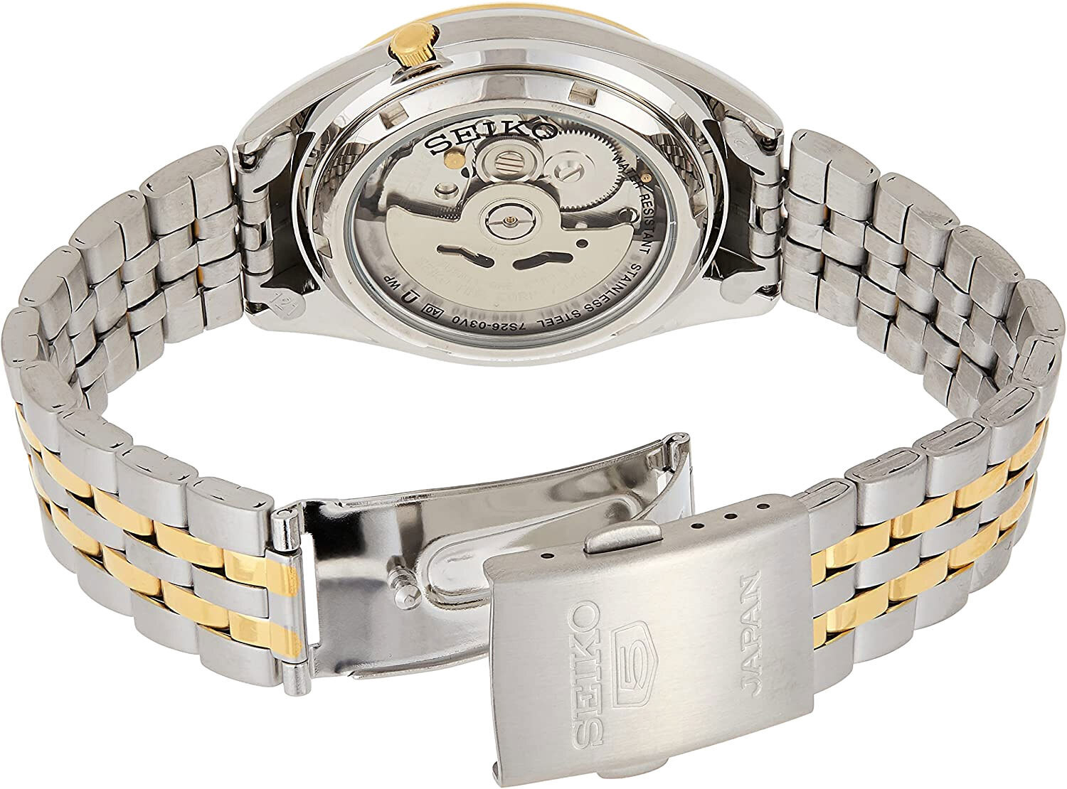Мужские аналоговые наручные механические часы с автоподзаводом. Серия Seiko 5.. Калибр механизма 7S26 (21 камень, частота полуколебаний баланса 21600 полуоб/час.). Механизм автоподзавода без возможности ручного подзавода. Центральные секундная, минутная и часовая стрелки. Светонакопительный состав на стрелках и часовых метках. Круглый корпус из нержавеющей стали с частичным PVD-покрытием цвета жёлтого золота. Диаметр корпуса 38мм. Рифленая переводная головка находится в положении 4 часа. Белый циферблат. Апертура даты и дня недели в положении 3 ч. Закаленное минеральное стекло Hardlex устойчивое к мелким механическим повреждениям. Прозрачная задняя крышка. Стальной браслет с частичным PVD-покрытием цвета жёлтого золота с раскладывающейся застежкой. Водозащита 30 WR (дождь, брызги).