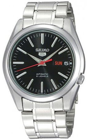 Мужские аналоговые наручные часы механические с автоподзаводом. Коллекции Automatic Seiko 5. Калибр механизма 7S26 (21 камень в механизме, 21 600 полуколебаний в час). Запас хода около 40-ка часов. Центральные часовая, минутная и секундная стрелки. Чёрный циферблат с часовыми метками в виде штрихов. Стрелки с люминесцентным напылением LumiBright, которое светится в темноте после непродолжительного воздействия света. Апертура даты и дня недели в позиции 3 ч. Стекло Хардлекс (Hardlex) - закаленное минеральное стекло, разработанное компанией Seiko Watch Corporation, которое обладает высокой устойчивостью к мелким механическим повреждениям и царапинам. Круглый корпус из нержавеющей стали. Диаметр корпуса 38 мм, толщина 11 мм. Переводная головка в позиции 4 ч. Прозрачная завинчивающаяся задняя крышка. Стальной браслет с раскладывающейся застежкой. Водонепроницаемость WR30 (брызги).