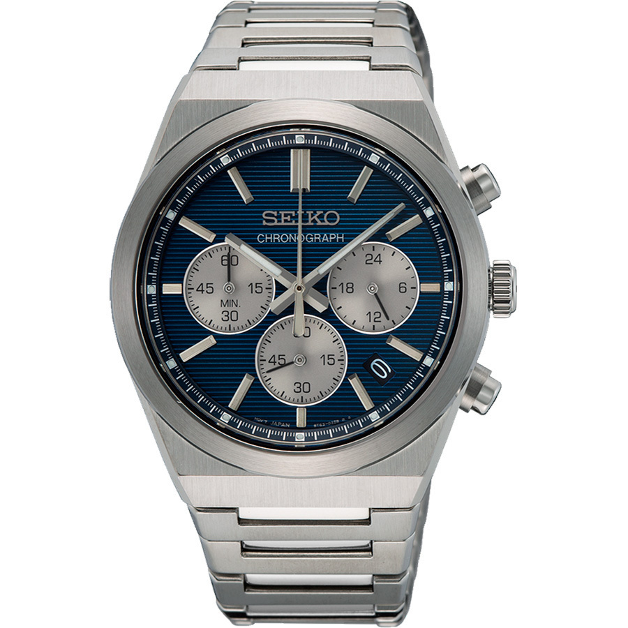 Мужские кварцевые аналоговые наручные часы-хронограф с секундомером. Коллекция Discover More. Секундомер до 1ч, точность 1/5с. Калибр механизма 8T63. Центральные часовая и минутная стрелки, секундная стрелка вынесена на отдельный малый циферблат в позиции 6 ч. Апертура даты между 4 и 5 часами. Стрелочный указатель времени суток с 24-х часовой шкалой вынесен на дополнительный малый циферблат в позиции 3 ч. Синий циферблат с часовыми метками в виде штрихов. Стрелки с люминесцентным покрытием LumiBrite, которое светится в темноте после непродолжительного воздействия света. Корпус из нержавеющей стали. Диаметр корпуса 40 мм, толщина 11,6 мм. Рифлёная переводная головка. Завинчивающаяся задняя крышка. Устойчивое к возникновению мелких царапин сапфировое стекло. Стальной браслет с раскладывающейся застёжкой. Водостойкость WR 100 (плавание и погружение без акваланга). Вес около 152 г.