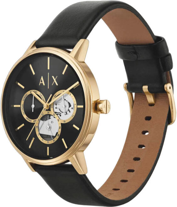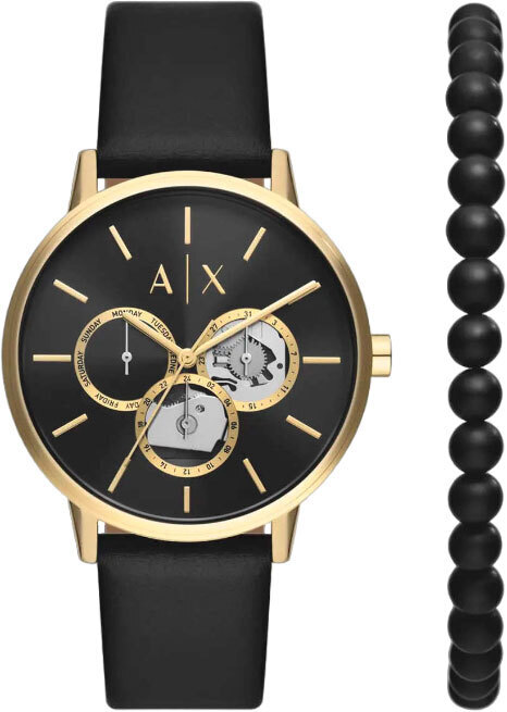 Комплект мужские часы и браслет. Мужские кварцевые аналоговые наручные часы. Коллекция Cayde. Центральные часовая, минутная и секундная стрелки. Время в 24-х часовом формате, дата и день недели вынесены на отдельные малые циферблаты. Чёрный циферблат с часовыми метками в виде штрихов. Сквозь прозрачное окошко на циферблате виден механизм часов. Круглый стальной корпус с покрытием цвета жёлтого золота. Устойчивое к мелким механическим повреждениям минеральное стекло. Чёрный кожаный ремешок с классической застёжкой buckle. Водонепроницаемость 50 WR (мытьё рук). В комплекте браслет из бусин чёрного цвета.