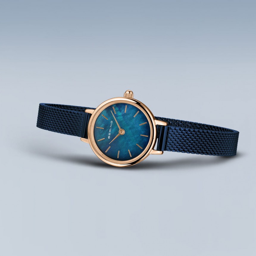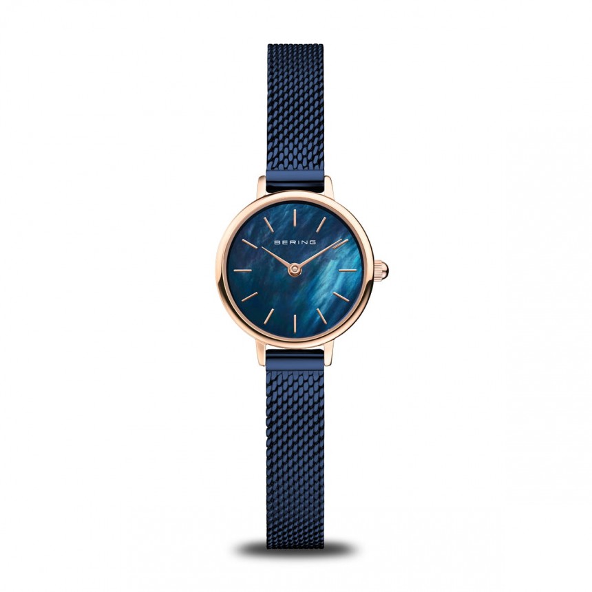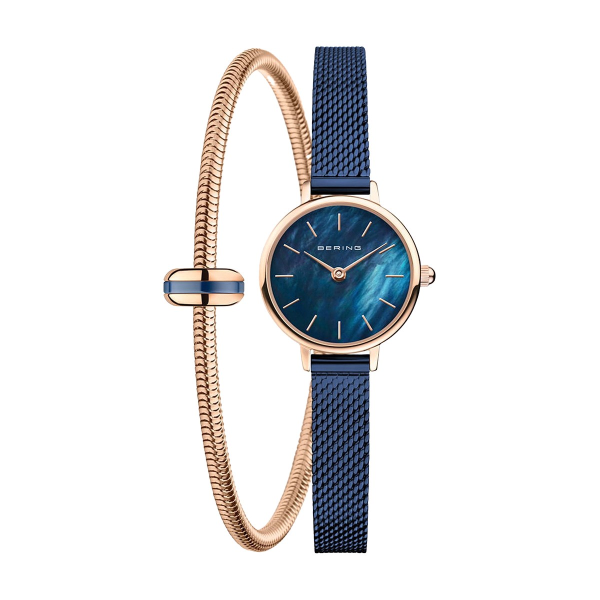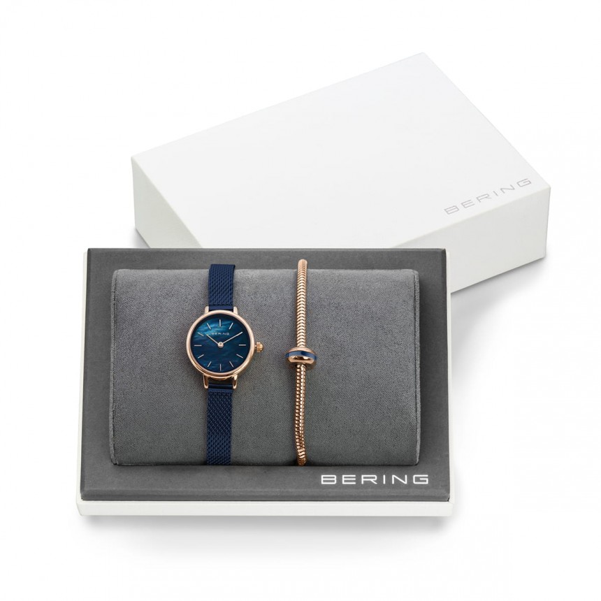 Элегантный подарочный набор, состоящий из наручных женских часов и браслета-змейки с шармом "lovely" - "Gift Set Lovely" ( «Подарочный набор Lovely»). Женские кварцевые наручные часы с аналоговым отображением времени (стрелочные). Серия Classic Collection. Центральные часовая и минутная стрелки золотистого цвета. Синий перламутровый циферблат с часовыми метками в виде золотистых штрихов. Круглый стальной полированный корпус с IP покрытием цвета розового золота. Диаметр корпуса 22 мм, толщина 6 мм. Устойчивое к возникновению мелких царапин плоское сапфировое стекло. Стальной браслет миланского плетения с синим IP покрытием. Ширина браслета 8 мм. Водонепроницаемость WR 30 (защита от брызг). В комплекте стальной браслет-змейка цвета розового золота с золотистым шармом с тёмно-синей керамической вставкой.