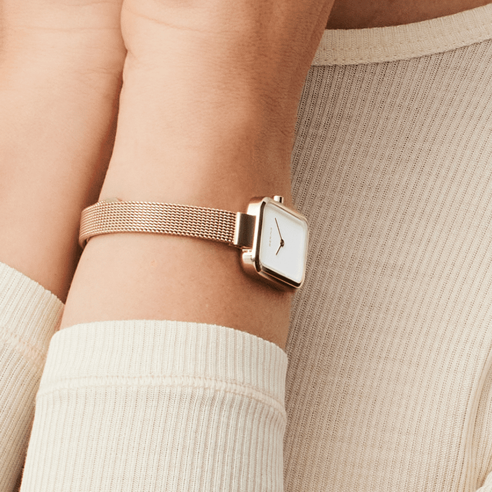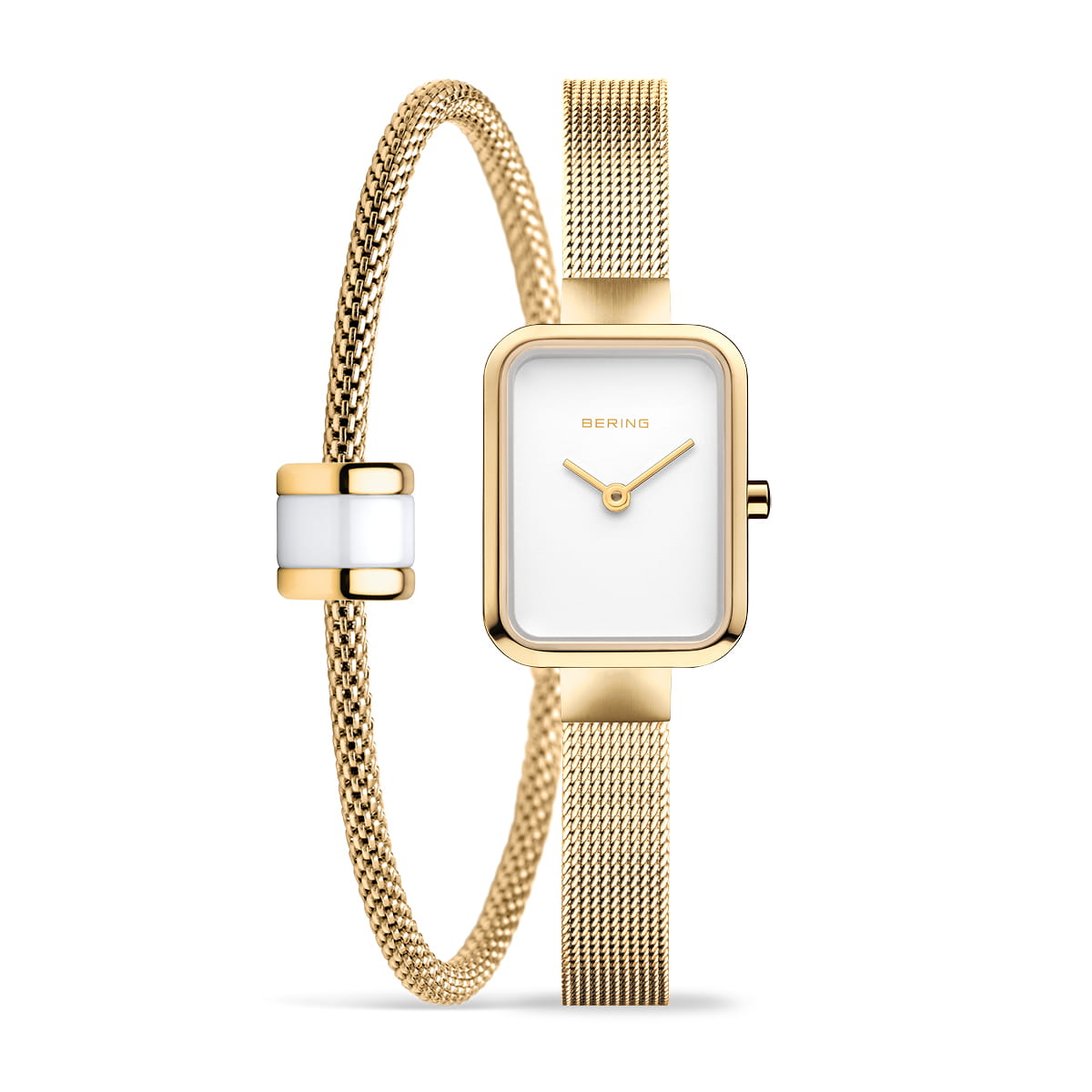 Элегантный подарочный набор, состоящий из наручных женских часов и браслета-змейки с шармом - сочетание чистых линий, современной роскоши и скандинавской элегантности. Неподвластное времени сияние – минималистичный дизайн в лучшем его проявлении. Женские кварцевые наручные часы с аналоговым отображением времени (стрелочные). Серия Petite Square. Механизм Miyota 5Y20. Центральные часовая и минутная стрелки золотистого цвета. Белый циферблат без индексов подчёркивает скандинавский минимализм. Прямоугольный стальной полированный корпус с IP покрытием цвета жёлтого золота. Размер корпуса 20 мм на 35 мм, толщина 8 мм. Устойчивое к возникновению мелких царапин плоское сапфировое стекло. Стальной браслет миланского плетения с IP покрытием цвета жёлтого золота. Ширина браслета 8 мм, длина браслета 175 мм. Водонепроницаемость WR30 (защита от брызг). В комплекте золотистый браслет-змейка и золотистый шарм с белой керамической вставкой. Вес около 35 г.