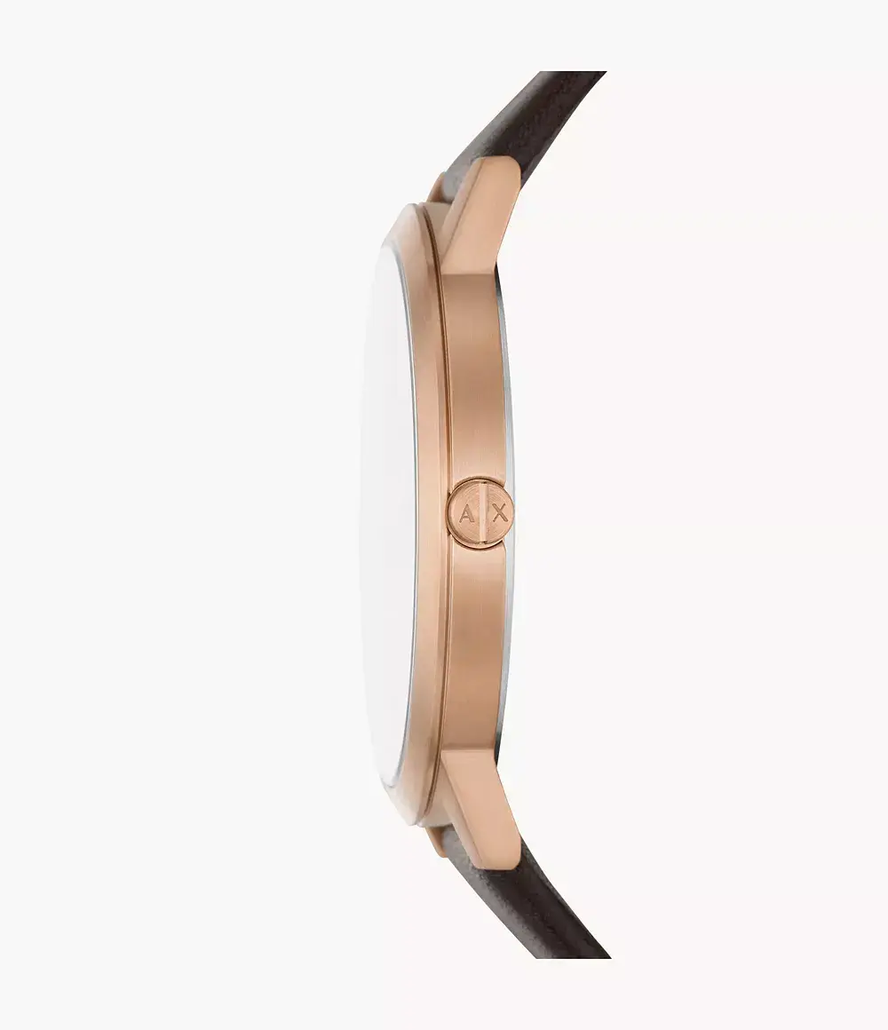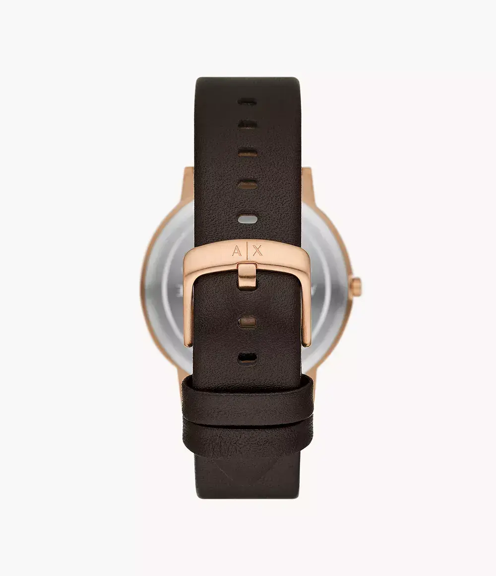 Кварцевые аналоговые наручные часы. Унисекс. Центральные часовая и минутная стрелки. Коричневый циферблат с часовыми метками в виде штрихов. Круглый стальной корпус с покрытием цвета розового золота. Диаметр корпуса 40 мм. Устойчивое к мелким механическим повреждениям минеральное стекло. Коричневый кожаный ремешок с классической застёжкой buckle. Водозащищённость 30WR (брызги).