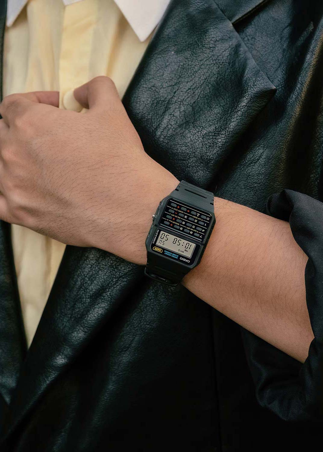 Легендарные часы для поклонников фильма «Назад в будущее», именно такую модель носил Марти Макфлай. Кварцевые наручные часы с цифровым отображением времени. Серия EDGY. Унисекс часы. Калькулятор позволяет производить различные математические вычисления, используя числа, содержащие до 8 знаков. Второй часовой пояс. 12-ти и 24-х часовой формат отображения времени. Секундомер с точностью показаний 1/100 секунды и временем измерения 24 часа. Режимы измерения: прошедшее время, промежуточное время, два финишных результата. Ежедневный будильник, ежечасный сигнал. Возможность включения/ выключения звука кнопок. Автоматический календарь до 2079 года. Прямоугольный чёрный пластиковый корпус. Размеры корпуса 34.4 мм на 43.2 мм, толщина 8.2 мм. Чёрный пластиковый ремешок с классической застежкой buckle. Батарея рассчитана на 5 лет. Водонепроницаемость 30WR (защита от брызг). Вес около 25 г.