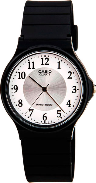 Кварцевые наручные часы c аналоговым отображением времени. Серия Casio Collection. Унисекс часы. Центральные часовая, минутная и секундная стрелки серебристого цвета. Белый циферблат с часовыми метками в виде арабских цифр. Круглый корпус из полимерного пластика чёрного цвета. Размер корпуса 33,8 мм на 38,8 мм, толщина 7,8 мм. Пластиковое стекло. Чёрный пластиковый ремешок с классической застёжкой buckle. Батарейка рассчитана на 2 года. Водонепроницаемость 30WR (защита от брызг). Вес около 20 г