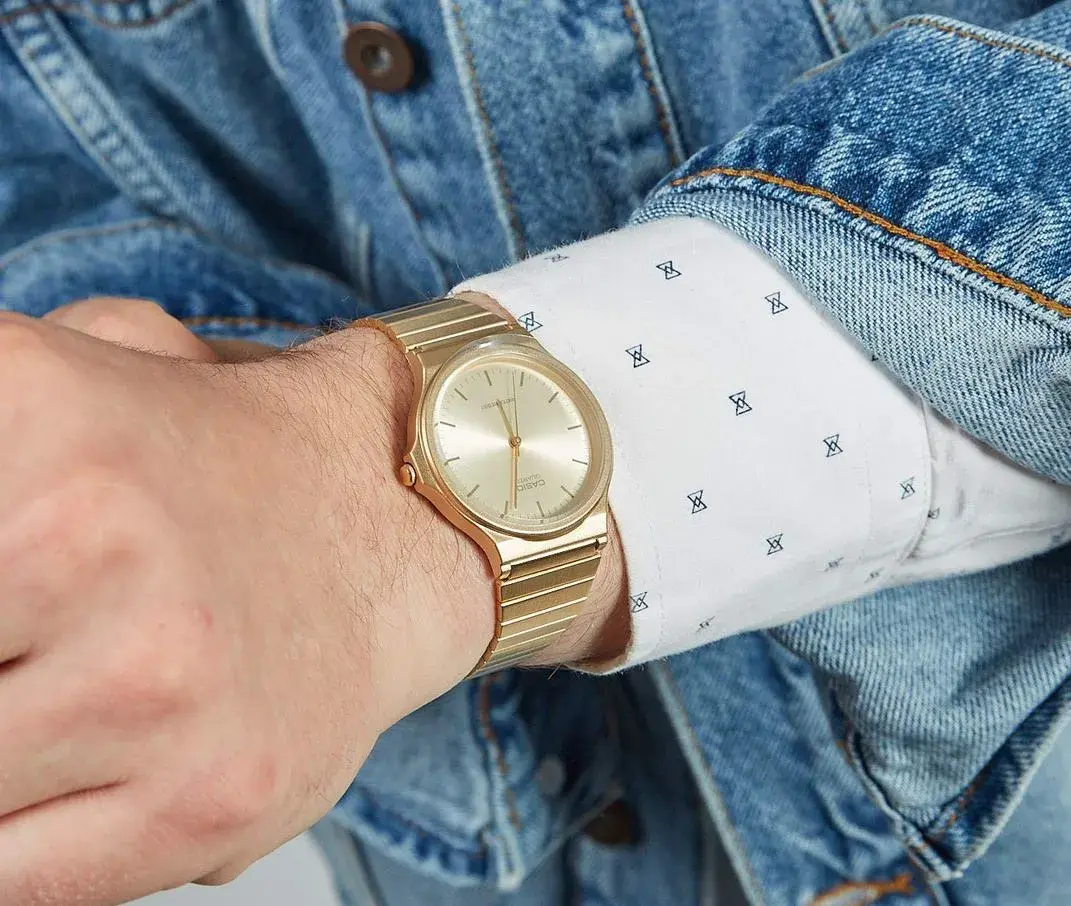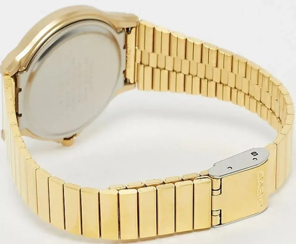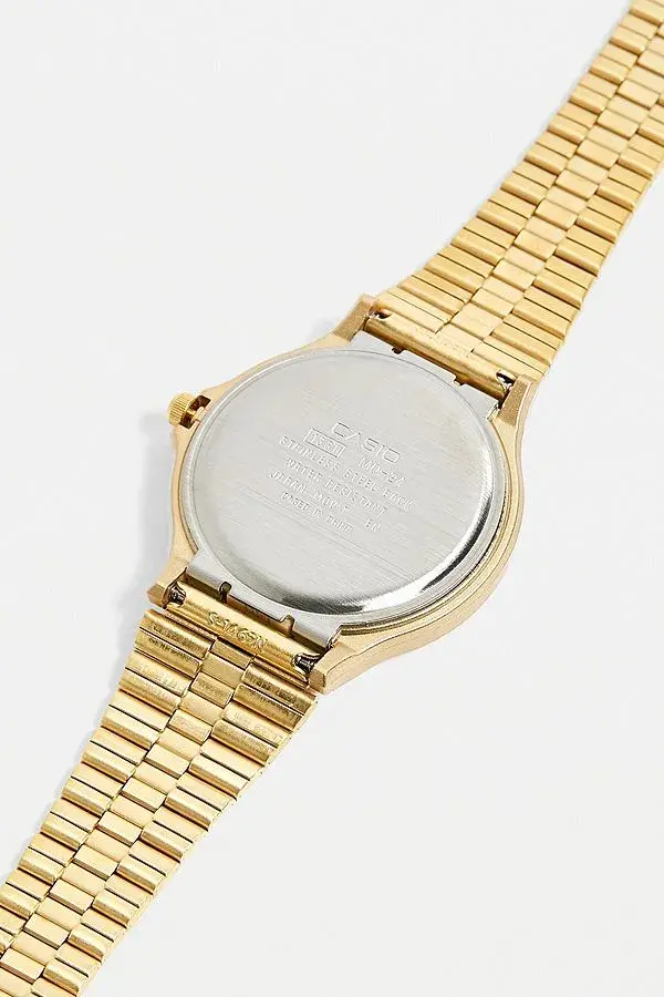 Кварцевые аналоговые наручные часы. Серия Casio Collection. Унисекс часы. Центральные часовая, минутная и секундная стрелки. Золотистый циферблат с часовыми метками в виде штрихов. Пластиковое стекло. Круглый пластиковый корпус золотистого цвета. Размеры корпуса 38.8 мм на 34.9 мм, толщина 7.8 мм. Рифлёная переводная головка с защитой. Стальной браслет с IP покрытием цвета жёлтого золота, Регулируемая застежка. Батарейка рассчитана на 3 года. Водонепроницаемость 30WR (защита от брызг). Вес около 45 г.