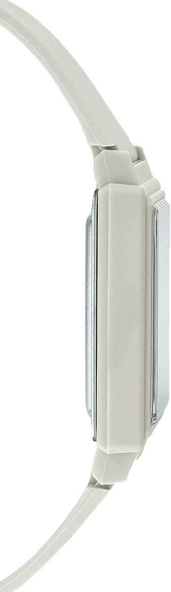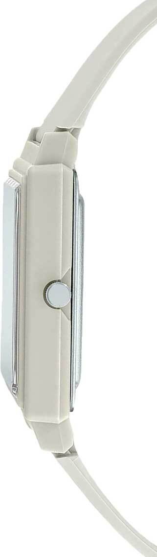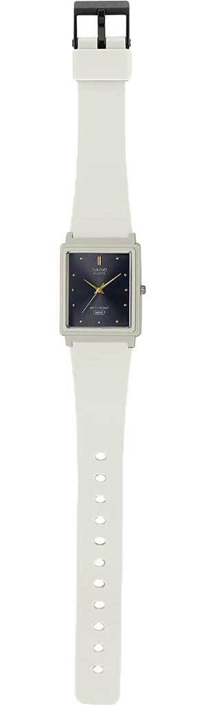 Кварцевые аналоговые наручные часы. Серия Casio Collection. Унисекс часы. Центральные часовая, минутная и секундная стрелки. Чёрный циферблат с часовыми метками в виде точек. Пластиковое стекло. Прямоугольный пластиковый корпус белого цвета. Размеры корпуса 37.2 мм на 26.5 мм, толщина 8,1 мм. Рифлёная переводная головка. Белый пластиковый ремешок с классической застёжкой buckle. Батарейка рассчитана на 3 года. Водонепроницаемость 30WR (защита от брызг). Вес около 45 г.