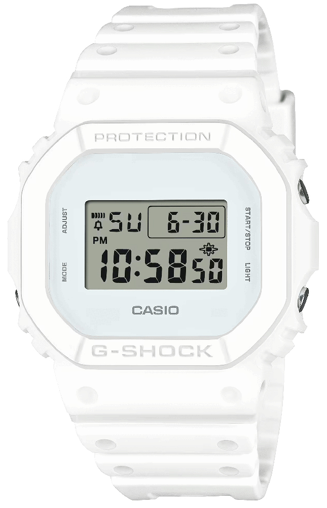 Электронные кварцевые часы с цифровым отображением времени. Коллекция G-Shock. Унисекс часы. Часы выполнены в монохромной белой цветовой гамме, сочетают в себе стильный минимализм, надежность и современные экологические материалы. Противоударный корпус защищает механизм часов от ударов и вибрации. Электролюминесцентная подсветка освещает весь дисплей, функция послесвечения. Световая индикация сигнала (LED-индикатор) - светодиодная лампочка мигает при сигнале будильника, окончании таймера обратного отсчета или секундомера. Секундомер с точностью показаний 1/100 секунды (первый час), 1 секунда (через 1 час) и временем измерения 24 часа. Режимы измерения: прошедшее время, промежуточное время, два финишных результата. Таймер обратного отсчета от 1 секунды до 24 часов с автоповтором. 12-ти и 24-х- часовой формат отображения времени. Многофункциональный будильник, ежедневный звуковой сигнал, индикация начала часа. Автоматический календарь до 2099 г. Прямоугольный корпус из биопластика (изготавливается из возобновляемых органических ресурсов) белого цвета. Размер корпуса 42,8 мм на 48,9 мм, толщина 13,4 мм. Белый ремешок из биопластика (изготавливается из возобновляемых органических ресурсов) со стандартной застёжкой Buckle. Минеральное стекло устойчивое к мелким механическим повреждениям. Стальная задняя крышка. Батарейка рассчитана на 5 лет. Водонепроницаемость WR200 (плавание и ныряние без акваланга). Вес около 52 г.