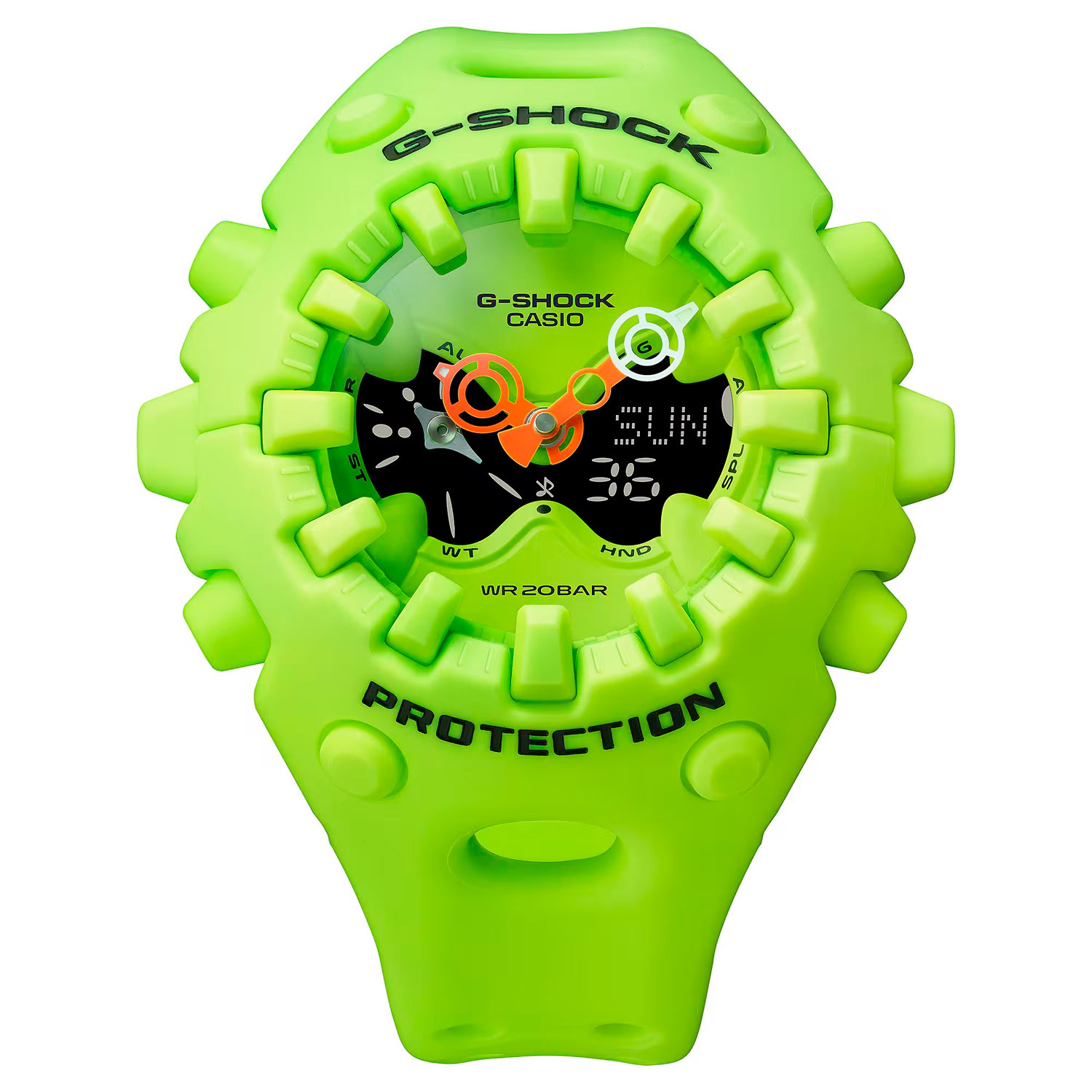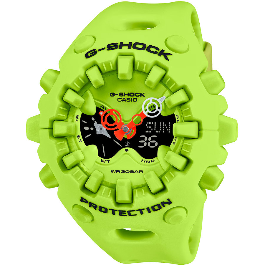 Кварцевые аналого-цифровые наручные часы. Серия G-Shock CoolEyes. Унисекс часы. Новинка отличается смелым дизайном: яркая расцветка, необычная форма 58-миллиметрового корпуса, дисплей-бабочка (CoolEyes), 3D-часовые метки расположенные снаружи корпуса и интегрированные в рант, устойчивое к ударам сферическое минеральное стекло. Противоударный пластиковый корпус защищает механизм часов от ударов и вибраций. Двойная светодиодная подсветка (циферблата и ЖК-дисплея) с функцией послесвечения, настройка продолжительности подсветки 1,5 или 3 с. Светящееся покрытие стрелок обеспечивает длительное послесвечение в темноте даже после короткого воздействия света. 12-ти и 24-х часовой формат отображения времени. Секундомер с точностью показаний 1/100 с и временем измерения 24 часа. Таймер обратного отсчета от 1 секунды до 24 часов с автоповтором. Мировое время - 31 часовой пояс (48 городов), всемирное координированное время (UTC), включение/отключение летнего времени. 5 ежедневных будильников (один с функцией повтора сигнала Snooze), ежечасный сигнал. Функция перемещения стрелок для удобного просмотра информации на цифровом экране. Функция отключения/включения звука кнопок. Автоматический календарь до 2099 года. Пластиковый корпус яркого жёлто-зелёного цвета. Размер корпуса 49,1 мм на 58,2мм, толщина 19,6мм. Устойчивое к мелким механическим повреждениям сферическое минеральное стекло. Жёлто-зелёный пластиковый ремешок со стандартной застёжкой buckle. Батарея рассчитана на 10 лет. Водонепроницаемость 200WR (плавание и ныряние без акваланга). Вес около 74 г.