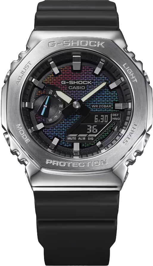 Мужские кварцевые аналогово-цифровые наручные часы. Серия G-Shock. Радужный кирпичный узор на циферблате символизирует дух прочности этих часов, такие же кирпичики были использованы на самых первых часах Casio G-Shock DW-5000C. Противоударный корпус из нержавеющей стали и полимерного пластика защищает механизм часов от ударов и вибраций. Двойная светодиодная подсветка обеспечивает подсветку не только цифрового дисплея, но и аналогового циферблата. Настройка продолжительности подсветки 1,5 или 3 секунды, послесвечение. Светящееся покрытие стрелок обеспечивает послесвечение в темноте после короткого воздействия света. 12-ти и 24-х часовой формат отображения времени. Секундомер с точностью показаний 1/100 с (первый час) и 1 с (после первого часа) и временем измерения 24 часа. Режимы измерения: прошедшее время, промежуточное время, два финишных результата. Таймер обратного отсчета от 1 секунды до 24 часов (с интервалом в 1 секунду) с автоповтором. Мировое время - 31 часовой пояс (48 городов), всемирное координированное время (UTC), включение/отключение летнего времени. 5 ежедневных будильников, ежечасный сигнал. Функция перемещения стрелок для удобного просмотра информации на цифровом дисплее. Ретроградный стрелочный указатель дня недели вынесен на дополнительный малый циферблат в положении 9 ч. Функция отключения/включения звука кнопок. Автоматический календарь до 2099 года. Восьмиугольный корпус серебртстого цвета из нержавеющей стали и полимерного пластика. Размер корпуса 44,4 мм на 49,3мм, толщина 11,8мм. Устойчивое к мелким механическим повреждениям минеральное стекло. Чёрный ремешок из биопластика (изготавливается из возобновляемых органических ресурсов) со стандартной застёжкой Buckle. Примерный срок службы батареи 3 года. Водонепроницаемость 200WR (плавание и ныряние без акваланга). Вес около 72 г.