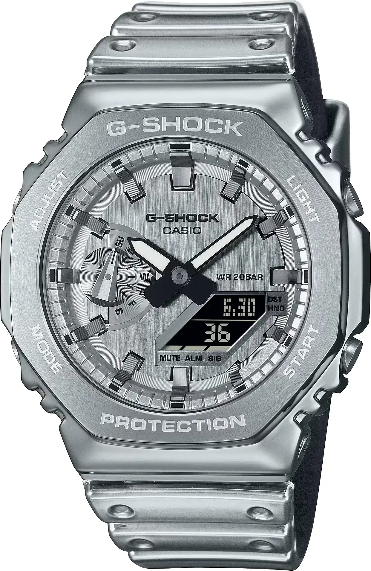 Кварцевые аналого-цифровые наручные часы. Унисекс. Серия G-Shock G-Steel, коллекция Fine Metallic. Одной из главных особенностей новинки стал ремешок из запатентованного материала Tough Silicone, внешний вид которого имитирует металл (таким образом вы получаете удобство полимерного ремешка и визуальную эффектность браслета). Tough Silicone сочетает в себе свойства силикона и полиуретана, обеспечивая высокую износостойкость, гибкость и комфорт (ремешок мягко облегает запястье, обеспечивая удобство ношения), эффектный внешний вид (полупрозрачный верхний слой с металлическим блеском напоминает металл, ремешок при этом остаётся лёгким и практичным). Противоударный корпус защищает механизм часов от ударов и вибраций. Двойная светодиодная подсветка обеспечивает подсветку не только цифрового дисплея, но и аналогового циферблата. Настройка продолжительности подсветки 1,5 или 3 секунды, послесвечение. Светящееся покрытие стрелок обеспечивает длительную подсветку в темное время суток после короткого воздействия света. 12-ти и 24-х часовой формат отображения времени. Секундомер с точностью показаний 1/100 с (первый час) и 1 с (после первого часа) и временем измерения 24 часа. Режимы измерения: прошедшее время, промежуточное время, два финишных результата. Таймер обратного отсчета от 1 секунды до 24 часов (с интервалом в 1 секунду) с автоповтором. Мировое время - 31 часовой пояс (48 городов), всемирное координированное время (UTC), включение/отключение летнего времени. 5 ежедневных будильников, ежечасный сигнал. Функция перемещения стрелок для удобного просмотра информации на цифровом экране. Функция отключения/включения звука кнопок. Автоматический календарь до 2099 года. Ретроградный стрелочный указатель дня недели. Пластиковый корпус серебристого цвета. Стальной восьмиугольный безель серебристого цвета. Размеры корпуса 49,3 мм на 44,4 мм, толщина 11,8 мм. Устойчивое к мелким механическим повреждениям минеральное стекло. Серебристый пластиковый ремешок Tough Silicone со стандартной застёжкой Buckle. Благодаря гибкости и идеальному прилеганию к запястью он обеспечивает максимальный комфорт при ношении. Водонепроницаемость 200WR (плавание и ныряние без акваланга). Примерный срок службы батареи 3 года. Вес около 84 г.