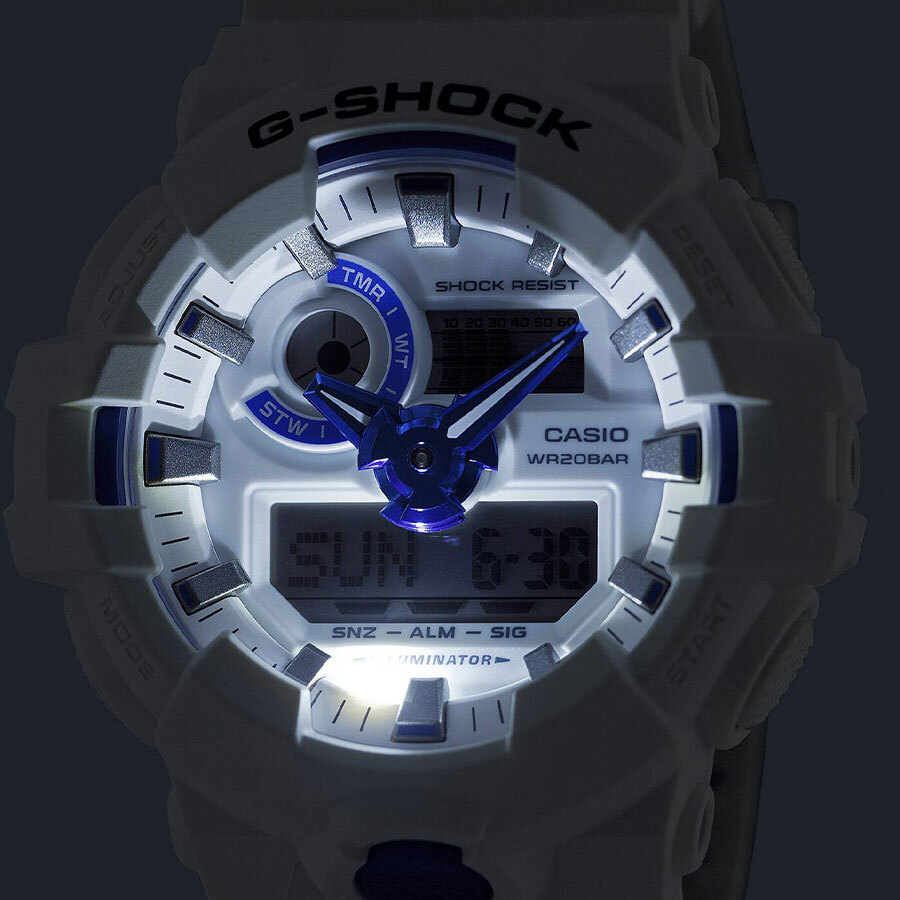 Кварцевые часы c аналого-цифровым отображением времени. Серия G-Shock. Унисекс часы. Отличительной чертой серии является люминесцентный циферблат с фосфоресцирующим эффектом, напоминающим сияние биолюминесцентного планктона в море. Противоударный корпус защищает внутренний модуль часов от повреждений и деформаций при ударах. Циферблат подсвечивается ярким светодиодом, настройка продолжительности подсветки 1,5 или 3 секунды, послесвечение. Светонакопительное покрытие стрелок обеспечивает длительное послесвечение в темноте после кратковременного воздействия света. 12-ти и 24-х часовой формат отображения времени. Секундомер с точностью показаний 1/100 секунды и временем измерения 24 часа. Режимы измерения: прошедшее время, промежуточное время, два финишных результата. Быстрое включение секундомера из режима Текущего времени. Таймер обратного отсчета от 1 мин до 60 мин (с интервалом в 1 минуту). Мировое время – 48 городов (31 часовой пояс), всемирное координированное время (UTC), переключение между домашним и мировым временем, функция включения/отключения летнего времени. Автоматический календарь до 2099 г. 5 ежедневных будильников (1 с функцией повтора сигнала Snooze); сигнал начала часа. Функция отключения/включения звука кнопок Mute. Функция перемещения стрелок для удобного просмотра информации на цифровых дисплеях. Круглый корпус из полимерного пластика белого цвета. Габаритные размеры корпуса 53,4 мм на 57,5мм, толщина 18,5мм. Минеральное стекло устойчивое к мелким механическим повреждениям. Белый пластиковый ремешок с классической застежкой buckle. Батарея рассчитана на 5 лет. Водонепроницаемость 200WR (плавание и ныряние без акваланга). Вес около 75 г.