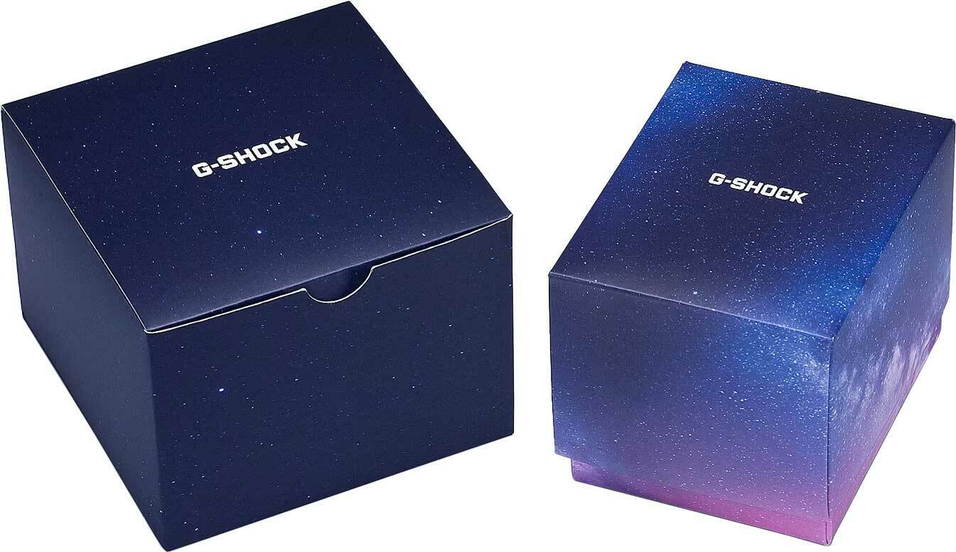 Кварцевые аналогово-цифровые наручные часы. Унисекс. Серия G-Shock Limited. Ограниченная серия G-Shock x China Aerospace Sky Creative создана совместно с Китайской компанией China Aerospace Sky Creative, которая занимается исследованием космоса. Противоударный корпус из нержавеющей стали, армированной углеродоными волокнами (Carbon-reinforced Stainless steel case) защищает механизм часов от ударов и вибраций. Двойная светодиодная подсветка обеспечивает подсветку не только цифрового дисплея, но и аналогового циферблата. Настройка продолжительности подсветки 1,5 или 3 секунды, послесвечение. Светящееся покрытие обеспечивает длительную подсветку в темное время суток после короткого воздействия света. 12-ти и 24-х часовой формат отображения времени. Секундомер с точностью показаний 1/100 с (первый час) и 1 с (после первого часа) и временем измерения 24 часа. Режимы измерения: прошедшее время, промежуточное время, два финишных результата. Таймер обратного отсчета от 1 секунды до 24 часов (с интервалом в 1 секунду) с автоповтором. Мировое время - 31 часовой пояс (48 городов), всемирное координированное время (UTC), включение/отключение летнего времени. 5 ежедневных будильников, ежечасный сигнал. Функция перемещения стрелок. Функция отключения/включения звука кнопок. Автоматический календарь до 2099 года. Усиленный углеродными волокнами стальной восьмиугольный корпус с покрытиеме фиолетового цвета. На корпусе часов рисунок множественных спиралей рукавов галактик, а цветовое решение циферблата напоминает Млечный Путь. Устойчивое к мелким механическим повреждениям минеральное стекло. Стальная задняя крышка крепится на 4-х винтах и украшена выгравированным изображением Млечного Пути. Пластиковый фиолетовый ремешок со стандартной застёжкой Buckle. Водонепроницаемость 200WR (плавание и ныряние без акваланга). Примерный срок службы батареи 3 года. Вес около 72 г. Часы поставляются в специальной упаковке с изображением Млечного Пути.