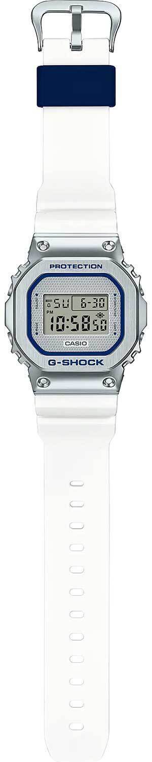 Кварцевые электронные наручные часы. Серия G-Shock. Унисекс. Противоударный корпус защищает механизм часов от ударов и вибрации. Электролюминесцентная подсветка обеспечивает равномерное освещение всего дисплея, послесвечение. LED-индикатор (световая индикация сигнала) - лампочка начинает мигать при сигнале будильника, окончании таймера обратного отсчета или секундомера. Многофункциональный будильник - ежедневный сигнал, ежемесячный сигнал, сигнал каждый день определенного месяца, на определенную дату, сигнал начала каждого часа. 12-ти и 24-х часовой формат отображения времени. Секундомер с точностью измерения 1/100 секунды (первые 60 минут) и 1 секунда (через 60 минут) и временем измерения 24 ч. Режимы измерения: прошедшее время, промежуточное время, два финишных результата. Таймер обратного отсчета от 1с до 24ч с автоповтором. Автоматический календарь до 2099 года. Устойчивое к мелким механическим повреждениям минеральное стекло. Восьмиугольный корпус из нержавеющей стали и полимерного пластика. Размеры корпуса 43,2 мм на 49,6мм, толщина 12,9мм. Стальная задняя крышка крепится на 4-х винтах. Белый пластиковый ремешок, стандартная застёжка buckle. Приблизительный срок службы батареи 2 года. Водонепроницаемость 200 WR (плавание и погружение без акваланга). Вес примерно 73 г.