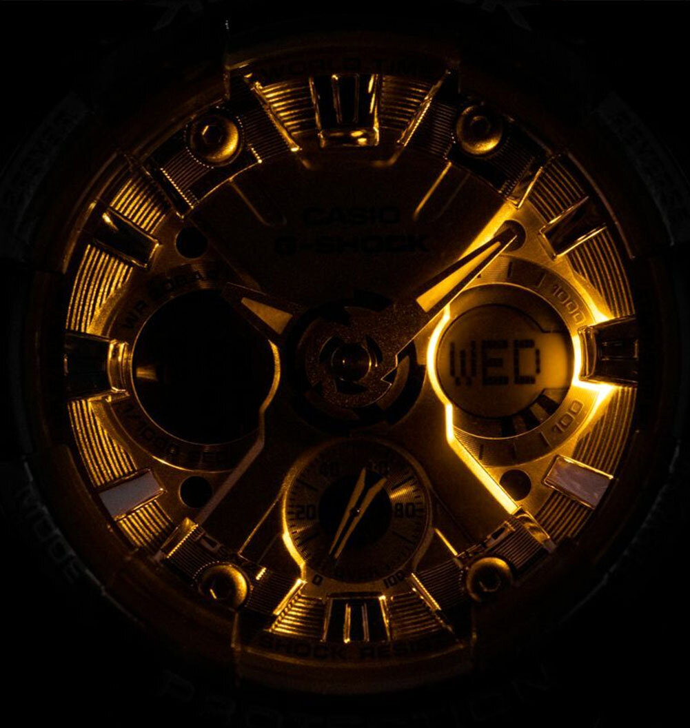 Кварцевые наручные часы c аналого-цифровым отображением времени. Серия Casio G-Shock S-series. Унисекс. Противоударный корпус защищает механизм часов от ударов и вибрации. Часы созданы с защитой от магнитных полей. Автоматическая светодиодная подсветка — при недостаточном освещении поворот руки включает подсветку циферблата, выбор продолжительности подсветки 1,5 секунды или 3 секунды, послесвечение. Стрелки с люминесцентным покрытием, которое светится в темноте после непродолжительного воздействия света. Мировое время – 48 городов (29 часовых поясов), всемирное координированное время (UTC), включение/отключение летнего времени, переключение между домашним и мировым временем. 12-ти и 24-х часовой формат отображения времени. Секундомер с точностью показаний 1/1000 с и временем измерения 100 ч. Режимы измерения: пройденное время, время круга, промежуточное время. Расчет скорости по выбранной дистанции. Таймер обратного отсчета от 1 мин до 24 ч (с интервалом в 1 минуту и с интервалом в 1 час) с автоповтором. 5 ежедневных будильников, один с функцией повтора сигнала (Snooze), ежечасный сигнал. Автоматический календарь до 2099 года. Круглый корпус из полупрозрачного пластика зелёного цвета. Размер корпуса 45,9 мм на 49мм, толщина 15,8мм. Устойчивое к мелким механическим повреждениям минеральное стекло. Полупрозрачный пластиковый ремешок зелёного цвета с классической застежкой Buckle. Приблизительный срок службы батареи 3 года. Водонепроницаемость 200 WR (плавание и ныряние без акваланга). Вес около 55 г.