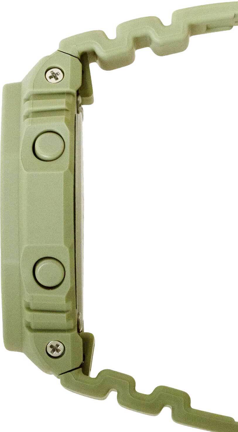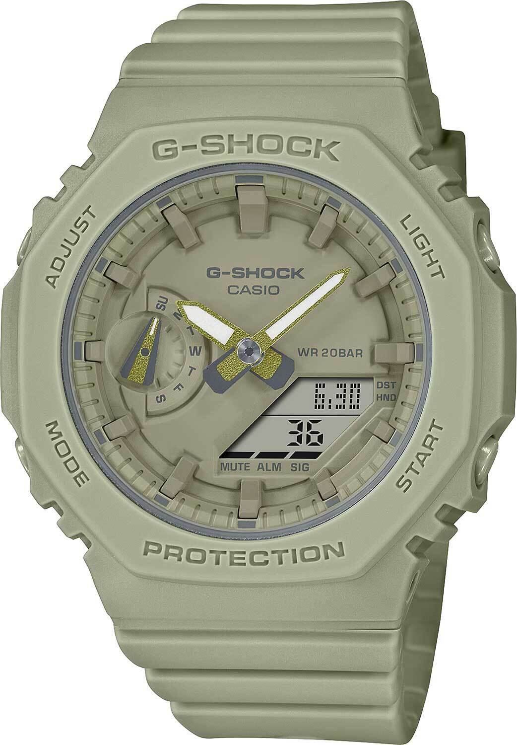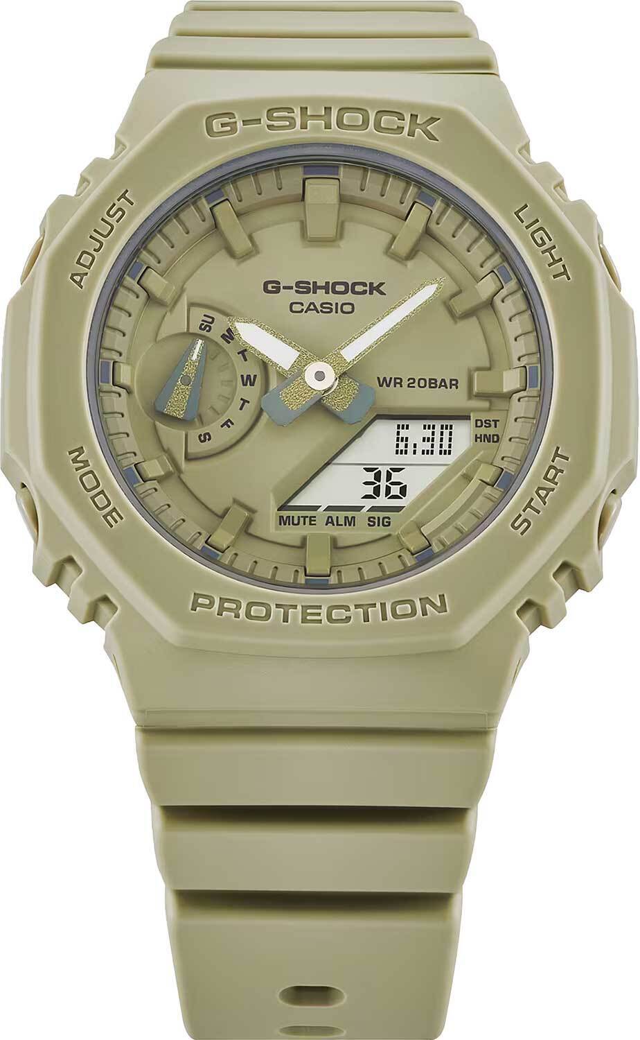 Кварцевые аналогово-цифровые наручные часы. Серия G-Shock Carbon Core Guard. Унисекс. Противоударный пластиковый корпус с углеродными волокнами (структура Carbon Core Guard) более прочный и в то же время более легкий, защищает механизм часов от ударов и вибраций. Двойная светодиодная подсветка обеспечивает подсветку не только цифрового дисплея, но и аналогового циферблата. Настройка продолжительности подсветки 1,5 или 3 секунды, послесвечение. Светящееся покрытие стрелок обеспечивает длительное послесвечение в темное время суток после короткого воздействия света. 12-ти и 24-х часовой формат отображения времени. Ретроградный стрелочный указатель дня недели находится в позиции 9 ч. Секундомер с точностью показаний 1/100 с (первый час) и 1 с (после первого часа) и временем измерения 24 часа. Режимы измерения: прошедшее время, промежуточное время, два финишных результата. Таймер обратного отсчета от 1 секунды до 24 часов (с интервалом в 1 секунду) с автоповтором. Мировое время - 31 часовой пояс (48 городов), всемирное координированное время (UTC), включение/отключение летнего времени. 5 ежедневных будильников, ежечасный сигнал. Функция перемещения стрелок для удобного просмотра информации на цифровом экране. Функция отключения/включения звука кнопок. Автоматический календарь до 2099 года. Усиленный углеродными волокнами пластиковый восьмиугольный корпус зелёного цвета. Размеры корпуса 42,9х46,2мм, толщина 11,2мм. Устойчивое к мелким механическим повреждениям минеральное стекло. Пластиковый зелёный ремешок со стандартной застёжкой Buckle. Примерный срок службы батареек 3 года. Водонепроницаемость 200WR (плавание и ныряние без акваланга). Вес около 41 г.