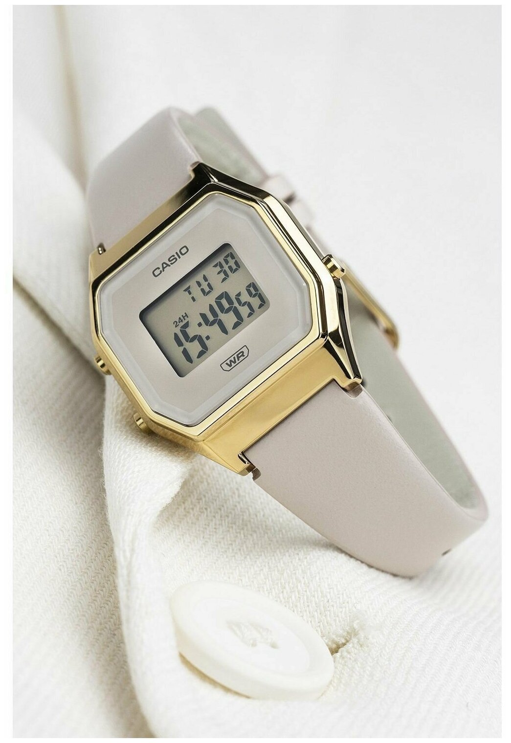 Электронные часы. Кремовый циферблат. Светодиодная подсветка. Функция секундомера с точностью 1/100 секунды и пределом измерения 1 час. Ежедневный будильник. Автоматический календарь. 12/24х часовой формат времени. Корпус выполнен из полимерного пластика золотистого цвета. Размер корпуса составляет 33,5 x 28,6 x 8,6 мм. Бежевый кожаный ремешок, стандартная застежка. Акриловое стекло. Водостойкие (брызги). Вес примерно 15 гр.