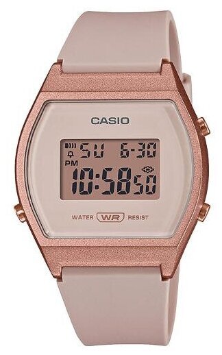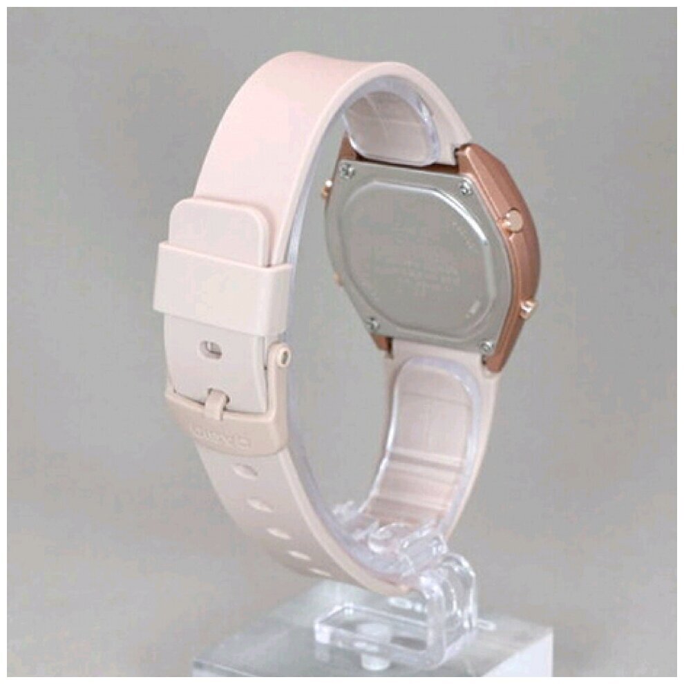 Электронные часы. Светодиодная подсветка. Функция секундомера с точностью 1/100 секунды и пределом измерения 24 часа. Таймер на 24 часа - время можно предварительно настроить от 1 секунды и до 100 часов. Часы могут затем автоматически начать отсчет в обратную сторону в установленное время. Идеальное решение для людей, которым необходимо ежедневно принимать лекарства или выполнять промежуточные упражнения (тренировки). Будильник с многофункциональными звуковыми сигналами. Функция повтора будильника. Автоматический календарь. 12/24х часовой формат времени. LED-индикатор. Корпус выполнен из полимерного пластика цвета розового золота. Размер корпуса составляет 39 х 35 х 9 мм. Розовый ремешок из полимерного материала, стандартная застежка. Акриловое стекло. Водостойкость WR 100 (плавание без погружения). Вес примерно 24 гр.
