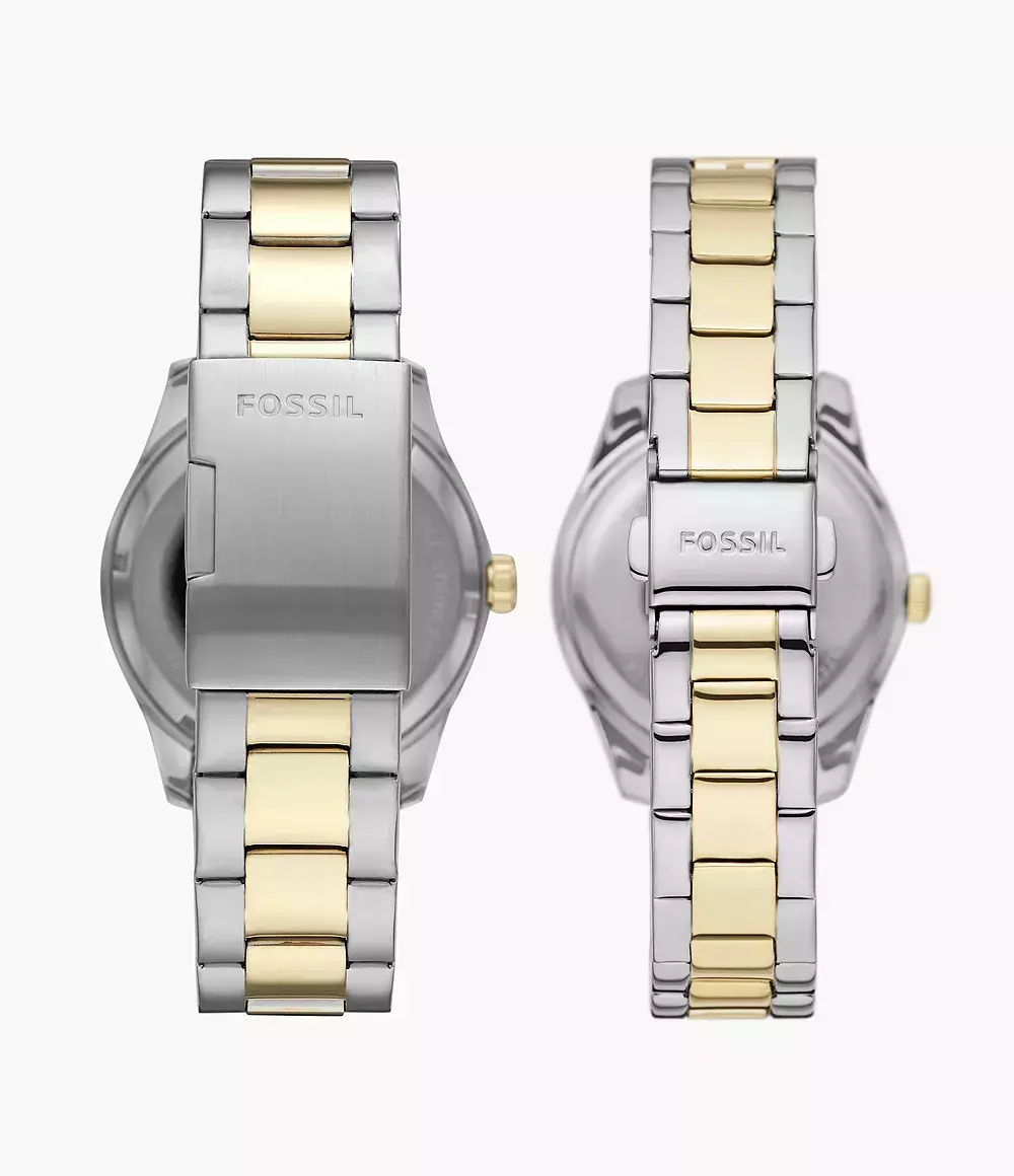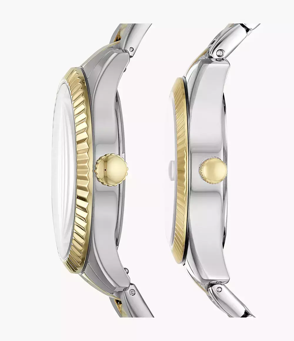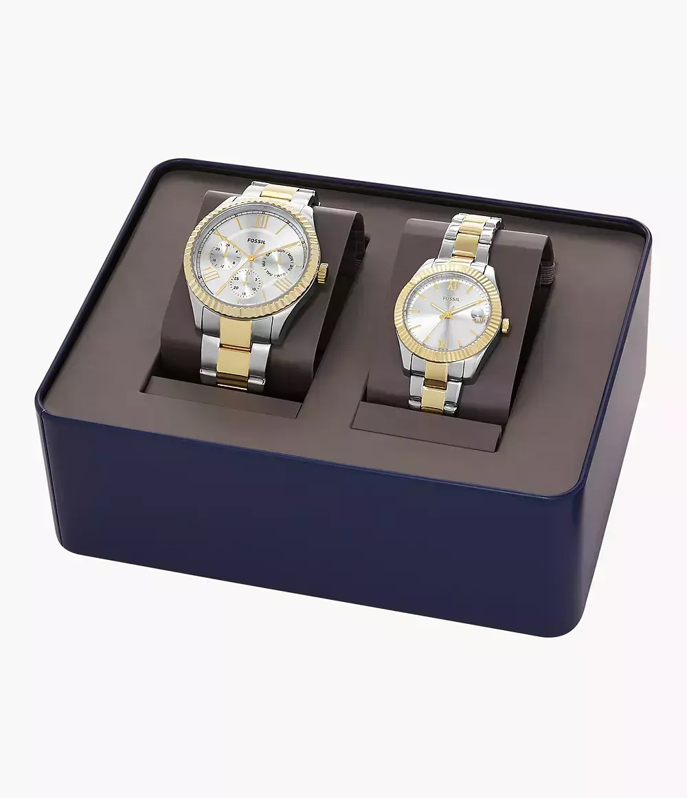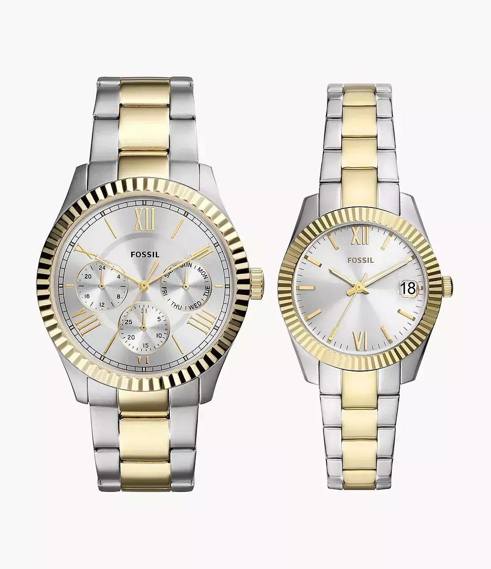 Набор состоит из мужских и женских кварцевых аналоговых наручных часов. Коллекция Chapman and Scarlette Mini. Мужские часы: круглый стальной корпус, серебристый циферблат центральные часовая, минутная и секундная стрелки, На дополнтьельных малых циферблатах отображаются число и день недели, рифлёный безель цвета жёлтого золота, стальной браслет с частичным IP- покрытием цвета жёлтого золота, водостойкость WR 50. Женские часы: круглый стальной корпус, серебристый циферблат, центральные часовая, минутная и секундная стрелки, окошко даты в положении 9 часов, рифлёный безель цвета жёлтого золота , стальной браслет с частичным IP-покрытием цвета жёлтого золота.