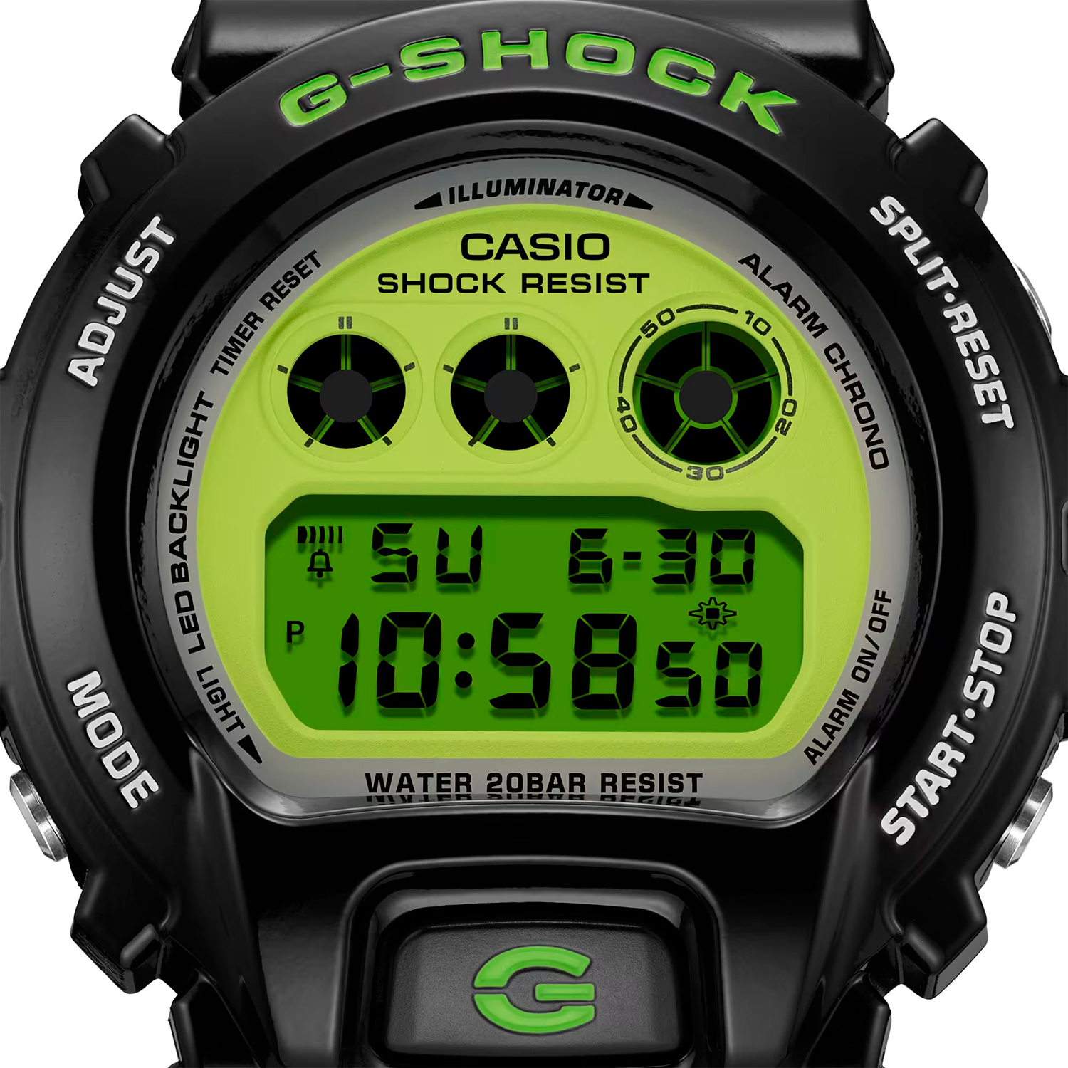 Кварцевые электронные наручные часы. Серия Casio G-Shock Crazy Colors. Унисекс. Противоударный корпус защищает механизм часов от ударов и вибрации. 12-ти и 24-х часовой формат отображения времени. Секундомер с точностью показаний 1/100 секунды (первые 60 минут) и 1 секунда (через 60 минут) и временем измерения 24 часа. Режимы измерения: прошедшее время, промежуточное время, два финишных результата. Таймер обратного отсчета от 1 с до 24 ч (с интервалом в 1 секунду, с интервалом в 1 минуту и с интервалом в 1 час) с автоповтором. Светодиодная подсветка, послесвечение. 4 многофункциональных будильника (ежедневный, датированный, ежемесячный, для каждого дня определенного месяца), один с функцией повтора сигнала. Автоматический календарь до 2099 года. Световая индикация сигнала (LED-индикатор)- светодиодная лампочка начинает мигать при сигнале будильника, окончании таймера обратного отсчета или секундомера. Круглый корпус из полимерного пластика чёрного цвета. Размеры корпуса 50 мм на 53,2 мм , толщина 18,7 мм. Устойчивое к мелким механическим повреждениям минеральное стекло. Чёрный пластиковый ремешок с классической застёжкой buckle. Срок службы батареи рассчитан на 5 лет. Водозащита WR200 (плавание и погружение без акваланга). Вес примерно 72 г.
