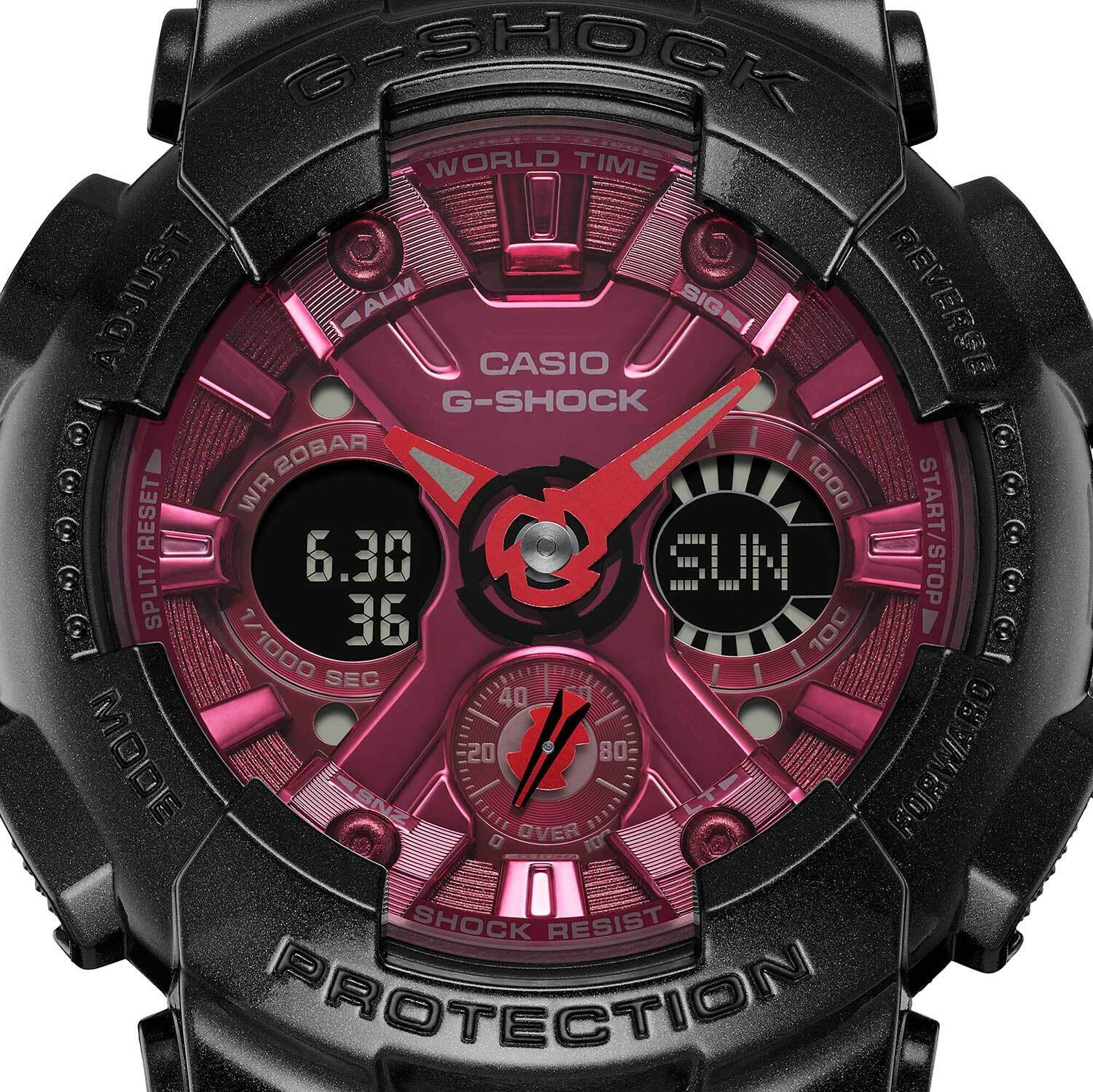 Женские кварцевые авлогово-цифровые наручные часы. Серия Casio G-Shock S-Series. Ударопрочная конструкция корпуса защищает механизм часов от ударов и вибрации. Часы созданы с защитой от воздействия магнитных полей. Автоматическая светодиодная подсветка — при недостаточном освещении поворот руки обеспечит автоматическое включение подсветки. Настраиваемое послесвечение 1,5 с или 3с. Необритовое светонакопительное покрытие стрелок обеспечивает длительное послесвечение в темноте после кратковременного воздействия света. 12/24-часовой формат отображения времени. Секундомер с точностью показаний 1/1000 с и временем измерения 100 ч. Режимы измерения: пройденное время, время круга, промежуточное время. Расчет скорости по выбранной дистанции. Таймер обратного отсчета от 1 мин до 24 ч ( (с интервалом 1 минута) с автоповтором. Мировое время - 48 городов (29 часовых поясов), всемирное координированное время (UTC). Функция включения/отключения летнего времени. Переключение между домашним и мировым временем.. 5 ежедневных будильников, один с функцией Snooze (повтор сигнала). Ежечасный сигнал. Автоматический календарь до 2099 года. Круглый корпус из полимерного пластика чёрного цвета. Размер корпуса 45,9 мм на 49 мм, толщина 15,8мм. Чёрный пластиковый ремешок с классической застёжкой buckle. Батарея рассчитана на 3 года. Водонепроницаемость 200WR (плавание и погружение без акваланга). Вес приблизительно 55 г.