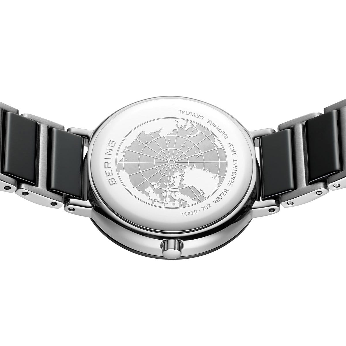 Женские кварцевые наручные часы с аналоговым отображением времени (стрелочные). Эти женские часы из коллекции Bering Ceramic Diamond воплощают в себе суть скандинавской элегантности. Черный циферблат с эффектом солнечных лучей, украшенный четырьмя кристаллами, подобно мерцающему свету на замерзшем озере, добавляют изысканный оттенок роскоши. Датский дизайн, вдохновлённый красотой Арктики - современная элегантность в сочетании с вневременным и сдержанным минимализмом. Механизм MIYOTA 9T22. Центральные часовая и минутная стрелки серебристого цвета. Чёрный циферблат с часовыми метками в виде кристаллов. Круглый стальной полированный корпус с чёрным керамическим безелем. Диаметр корпуса 29 мм, толщина 6 мм. Устойчивое к возникновению мелких царапин плоское сапфировое стекло. Стальной браслет из нержавеющей стали с чёрными керамическими вставками. Ширина браслета 15 мм, длина браслета 150 мм. Керамический материал очень легкий и устойчивый к царапинам, и также обладает «эффектом гладкого прикосновения» (Smooth Touch) - для ощущения особой мягкости при ношении. Водонепроницаемость WR50 (мытьё рук, дождь).