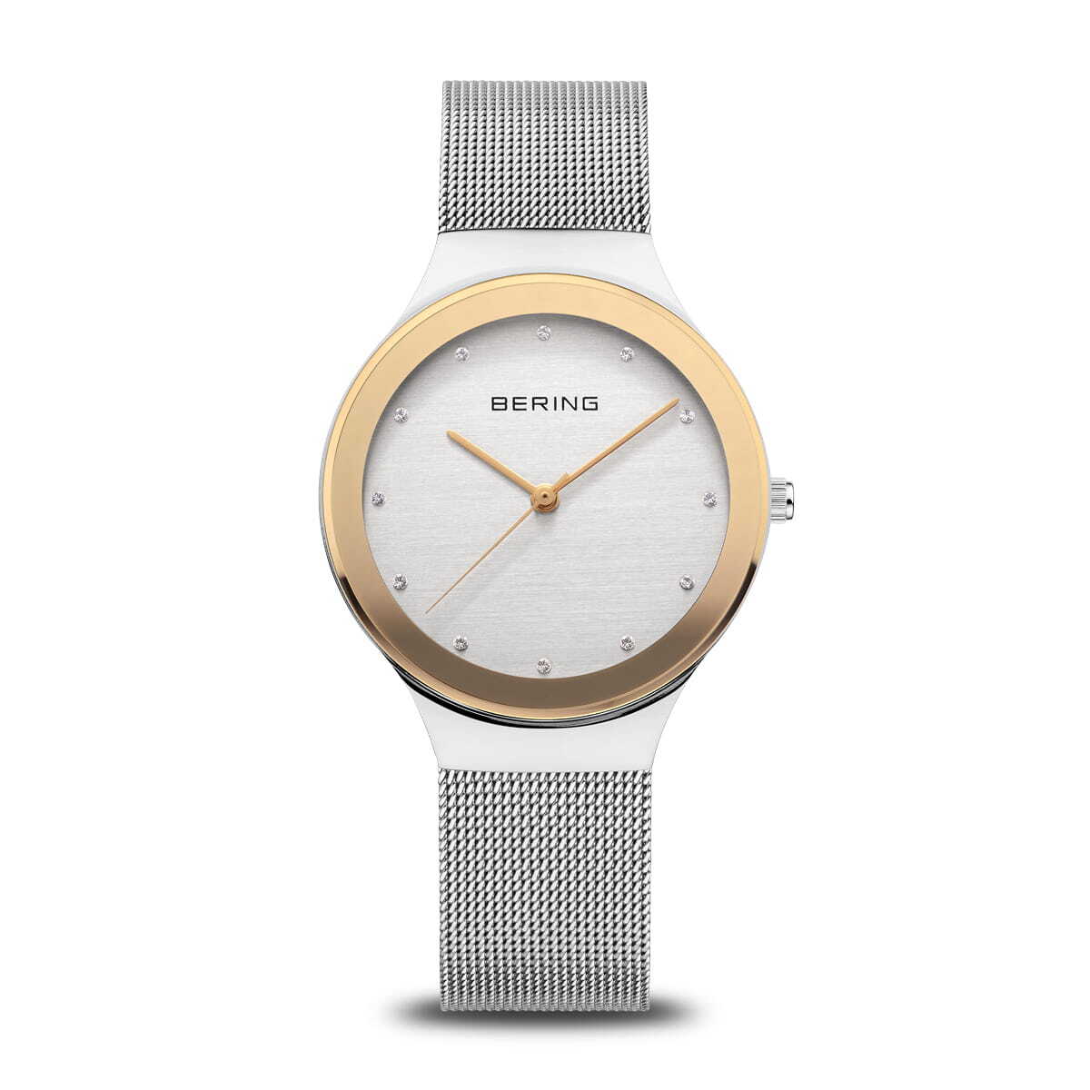 Элегантная, женственная модель BERING Classic 12934-010 сочетает в себе утонченные материалы и нотку роскоши. Овальный силуэт и изысканное сочетание серебра и золота делают ее неподвластным времени спутником для тех, кто ценит чистые линии и сдержанный блеск. Серебристый циферблат с матовой отделкой обрамлен сверкающими хрустальными циферблатами, которые мягко отражают свет. Золотистые стрелки идеально сочетаются с полированным золотым безелем, придавая минималистичному дизайну теплый и элегантный акцент. Тонкий корпус из нержавеющей стали высотой всего 7 мм удобно сидит на запястье. Часы дополнены серебряным ремешком миланского производства тонкой работы, который легко надевается и застегивается на практичную раскладывающуюся застежку. Модель BERING 12934-010, оснащенная плоским сапфировым стеклом, устойчивым к царапинам, надежным кварцевым механизмом и водонепроницаемостью 3 атм, олицетворяет собой непреходящую, сдержанную красоту.