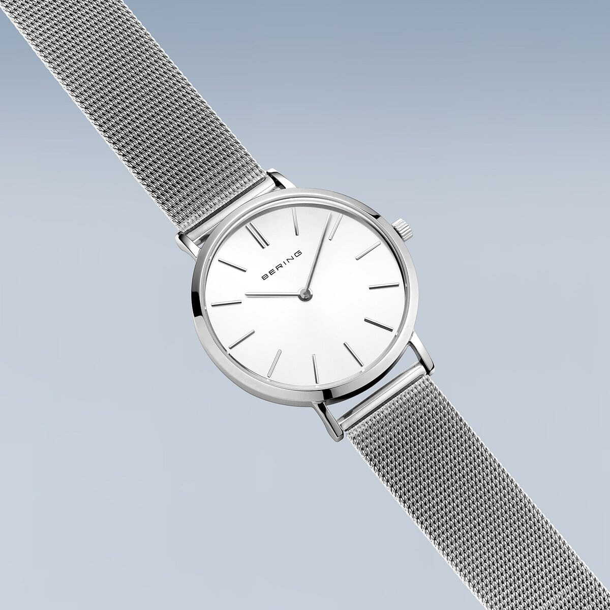 Эта женская модель из коллекции BERING Classic является ярким примером минималистского дизайна в чистом виде. Белый циферблат выглядит чистым и лаконичным, с тонкими часовыми метками и изящными стрелками, которые придают часам утонченный, но элегантный вид. Корпус из полированной нержавеющей стали диаметром 34 мм прекрасно сочетается с серебряным ремешком миланского производства тонкой работы. Его гладкая текстура легко ложится на запястье и дополняется надежной раскладывающейся застежкой - одновременно удобной и стильной. Плоское сапфировое стекло надежно защищает циферблат от царапин, а точный кварцевый механизм внутри обеспечивает точное отсчет времени. Водонепроницаемость этой модели составляет 3 атм, что делает ее идеальным дополнением для повседневной носки.