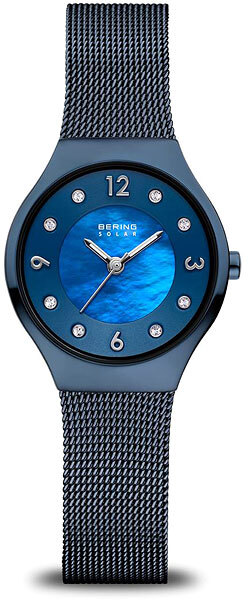 Женские кварцевые аналоговые наручные часы на солнечной батарее. Коллекция Slim Solar. Центральные часовая, минутная и секундная стрелки. Синий перламутровый циферблат с часовыми метками в виде штрихов и четырёх арабских цифр (12, 6, 3 и 9). Стрелки и метки с люминесцентным покрытием, которое светится в темноте после непродолжительного воздействия света. Окошко даты в позиции 3 ч. Питание от солнечной энергии (не нужно менять батарейки) - источником питания служит светочувствительная панель и аккумулятор, заряжаемый при попадании солнечного света на циферблат часов. Запас хода при полностью заряженной батарее от 6 до 12 месяцев. Круглый стальной корпус с IP покрытием синего цвета. Диаметр корпуса 27 мм, толщина 7 мм. Устойчивое к возникновению мелких царапин плоское сапфировое стекло. Стальной браслет миланского плетения с IP покрытием синего цвета. Ширина браслета 15 мм, длина браслета 167 мм. Водонепроницаемость WR50 (мытьё рук, дождь).