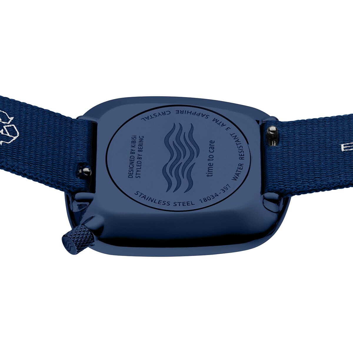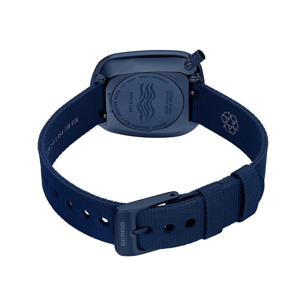 Женские аналоговые кварцевые наручные часы. Коллекция Ocean Pebble. Ремешки часов серии Ocean Pebble изготовлены из переработанного швейцарской компанией Tide Ocean морского пластика. Под девизом «Время заботиться» (“Time to Care”), который выгравирован на задней крышке часов, компания Bering подтверждает свою приверженность защите окружающей среды. Механизм Miyota 9T22. Центральные часовая и минутная стрелки серебристого цвета. Синий циферблат. Стальной полированный корпус с IP покрытием синего цвета в форме океанической гальки. Размер корпуса 34 мм на 30 мм, толщина 6 мм. Рифлёная переводная головка в правой верхней части корпуса. Устойчивое к возникновению мелких царапин плоское сапфировое стекло. Синий текстильный ремешок из переработанного океанического пластика с классической застёжкой buckle. Ширина ремешка 16 мм. Мотив волны на задней крышке и на переводной головке часов символизирует приверженность бренда защите океанов. Водонепроницаемость WR30 (защита от брызг). Часы поставляются в специальной упаковке.