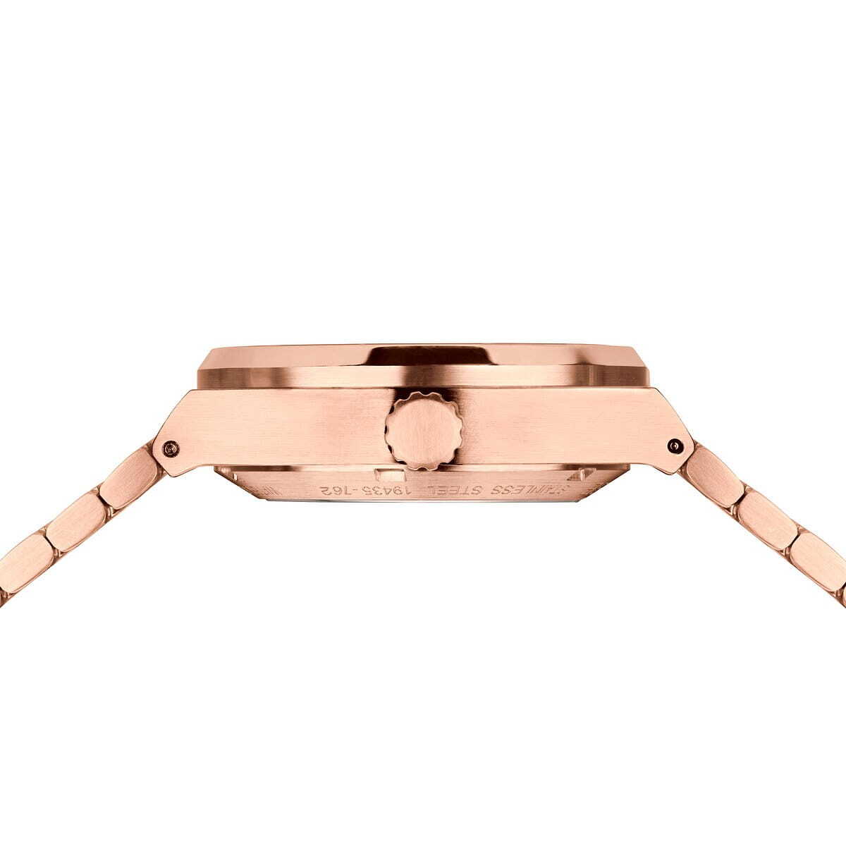 Женские аналоговые механические часы с автоподзаводом (используется пружинный источник энергии и специальный механизм, который вращается при движении руки и заводит основную пружину автоматически). Automatic Collection. Механизм Miyota 82S5. Центральные часовая и минутная стрелки, секундная стрелка вынесена на дополнительный малый циферблат, украшенный кристаллами. Чёрный перламутровый циферблат с часовыми метками в виде штрихов. Стрелки и метки с люминесцентным покрытием, которое светится в темноте после непродолжительного воздействия света. Круглый стальной корпус с IP покрытием цвета розового золота. Диаметр корпуса 35 мм, толщина 12 мм. Устойчивое к возникновению мелких царапин плоское сапфировое стекло. Стальной браслет с IP покрытием цвета розового золота, раскладывающаяся застёжка. Ширина браслета 11 мм, длина браслета 145 мм. Прозрачная задняя крышка. Водонепроницаемость WR100 (часы подходят для плавания с маской, трубкой, обычного плавания).
