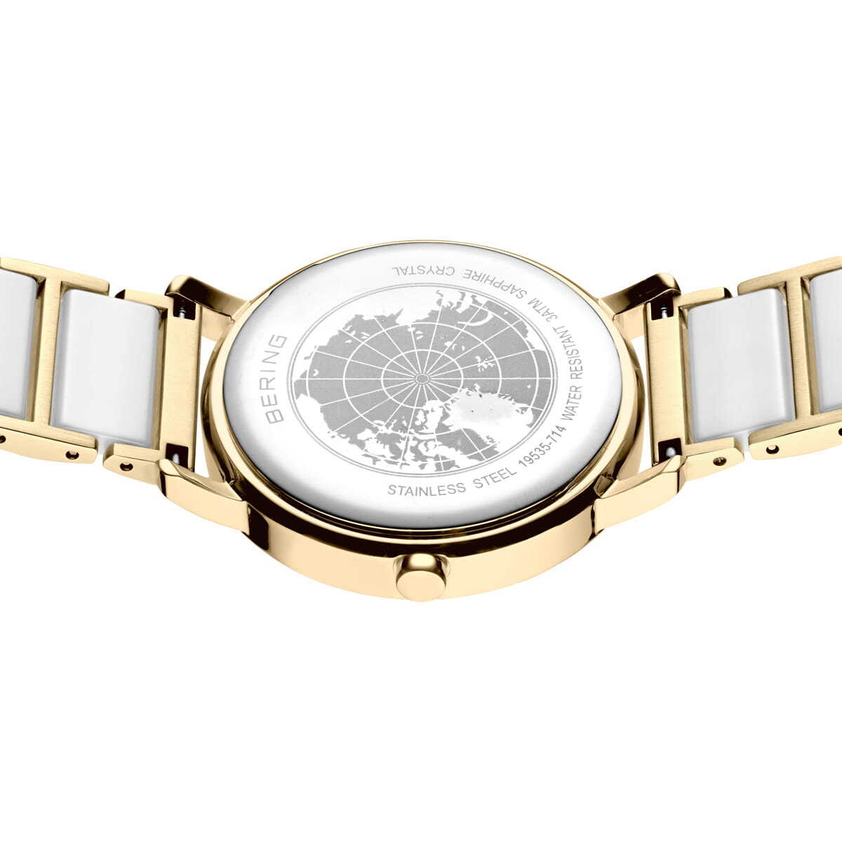 Женские кварцевые аналоговые наручные часы на солнечной батарее. Коллекция Slim Solar. Механизм Epson AS01AM. Центральные часовая, минутная и секундная стрелки золотистого цвета. Белый циферблат с часовыми метками в виде золотистых штрихов. Питание от солнечной энергии (не нужно менять батарейки) - источником питания служит светочувствительная панель и аккумулятор, заряжаемый при попадании солнечного света на циферблат часов. Запас хода при полностью заряженной батарее от 6 до 12 месяцев. Круглый стальной полированный корпус с IP покрытием цвета жёлтого золота. Диаметр корпуса 35 мм, толщина 8 мм. Устойчивое к возникновению мелких царапин плоское сапфировое стекло. Стальной браслет с IP покрытием цвета жёлтого золота и керамическими вставками белого цвета. Ширина браслета 18 мм, длина браслета 150 мм. Водонепроницаемость WR30 (защита от брызг).