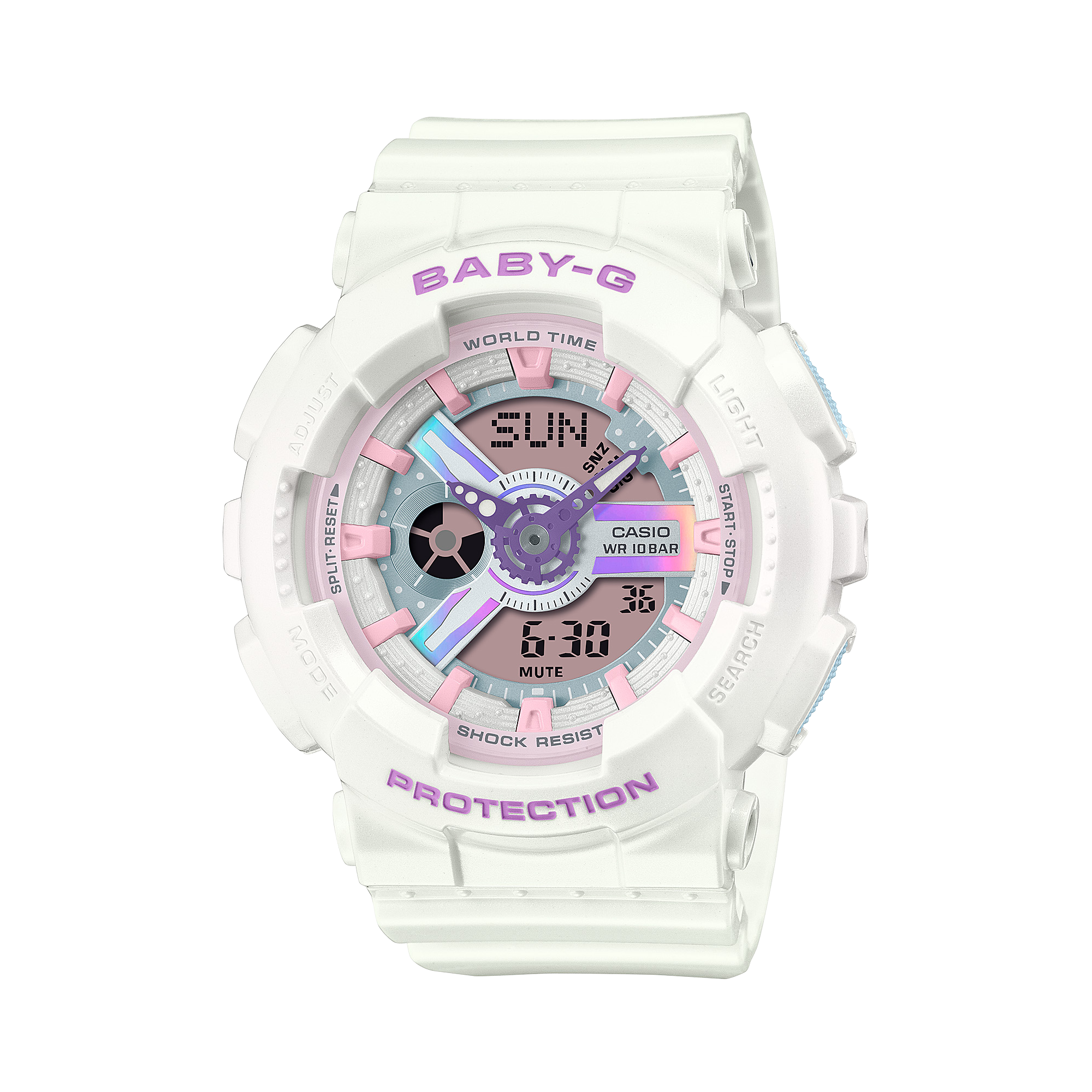 Женские кварцевые аналогово-цифровые часы. Коллекция Casio Baby-G. Противоударный корпус защищает механизм часов от ударов и вибрации. Светодиодная подсветка, послесвечение. 12-ти и 24-х часовой формат отображения времени. Центральные часовая и минутная стрелки. Стрелки с люминесцентным покрытием, которое светится в темноте после воздействия света. Секундомер с точностью показаний 1/100 секунды и временем измерения 24 часа. Режимы измерения: прошедшее время, промежуточное время, два финишных результата. Таймер обратного отсчета от 1 минуты до 24 часов (с интервалом 1 мин). Мировое время – 48 городов (29 часовых поясов),всемирное координированное время (UTC), функция летнего времени (DST). Функция включения/отключения звука кнопок. 5 независимых будильников (один с повтором сигнала), сигнал начала часа. Автоматический календарь до 2099 года. Круглый корпус из полимерного пластика. Устойчивое к мелким механическим повреждениям минеральное стекло. Пластиковый ремешок с классической застёжкой buckle. Водонепроницаемость 100 WR (плавание с маской и трубкой). Вес около 45 г