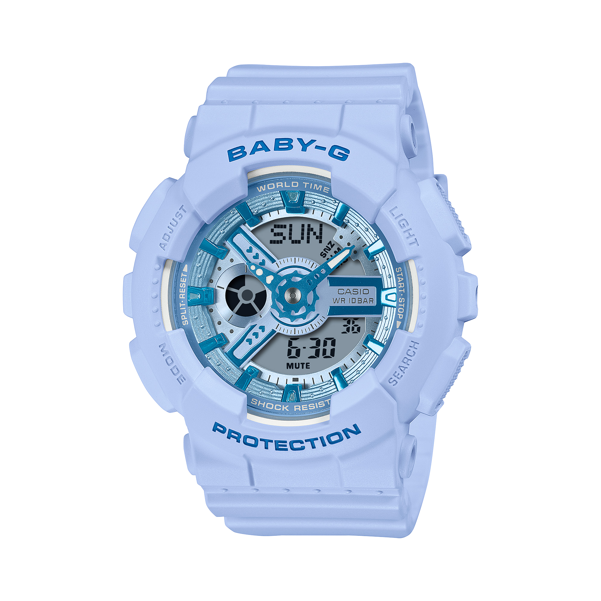 Женские кварцевые аналогово-цифровые часы. Коллекция Casio Baby-G. Противоударный корпус защищает механизм часов от ударов и вибрации. Светодиодная подсветка с функцией послесвечения. Светонакопительное покрытие стрелок обеспечивает длительное послесвечение в темноте после кратковременного воздействия света. 12-ти и 24-х часовой формат отображения времени. Центральные часовая и минутная стрелки. Секундомер с точностью показаний 1/100 секунды и временем измерения 24 часа. Режимы измерения: прошедшее время, промежуточное время, два финишных результата. Таймер обратного отсчета от 1 минуты до 24 часов (с интервалом 1 мин). Мировое время – 48 городов (29 часовых поясов), всемирное координированное время (UTC), функция летнего времени (DST). Функция включения/отключения звука кнопок. 5 независимых будильников (один с повтором сигнала), сигнал начала часа. Автоматический календарь до 2099 года. Круглый корпус из полимерного пластика. Устойчивое к мелким механическим повреждениям минеральное стекло. Пластиковый ремешок с классической застёжкой buckle. Водонепроницаемость 100 WR (плавание с маской и трубкой). Вес около 45 г.