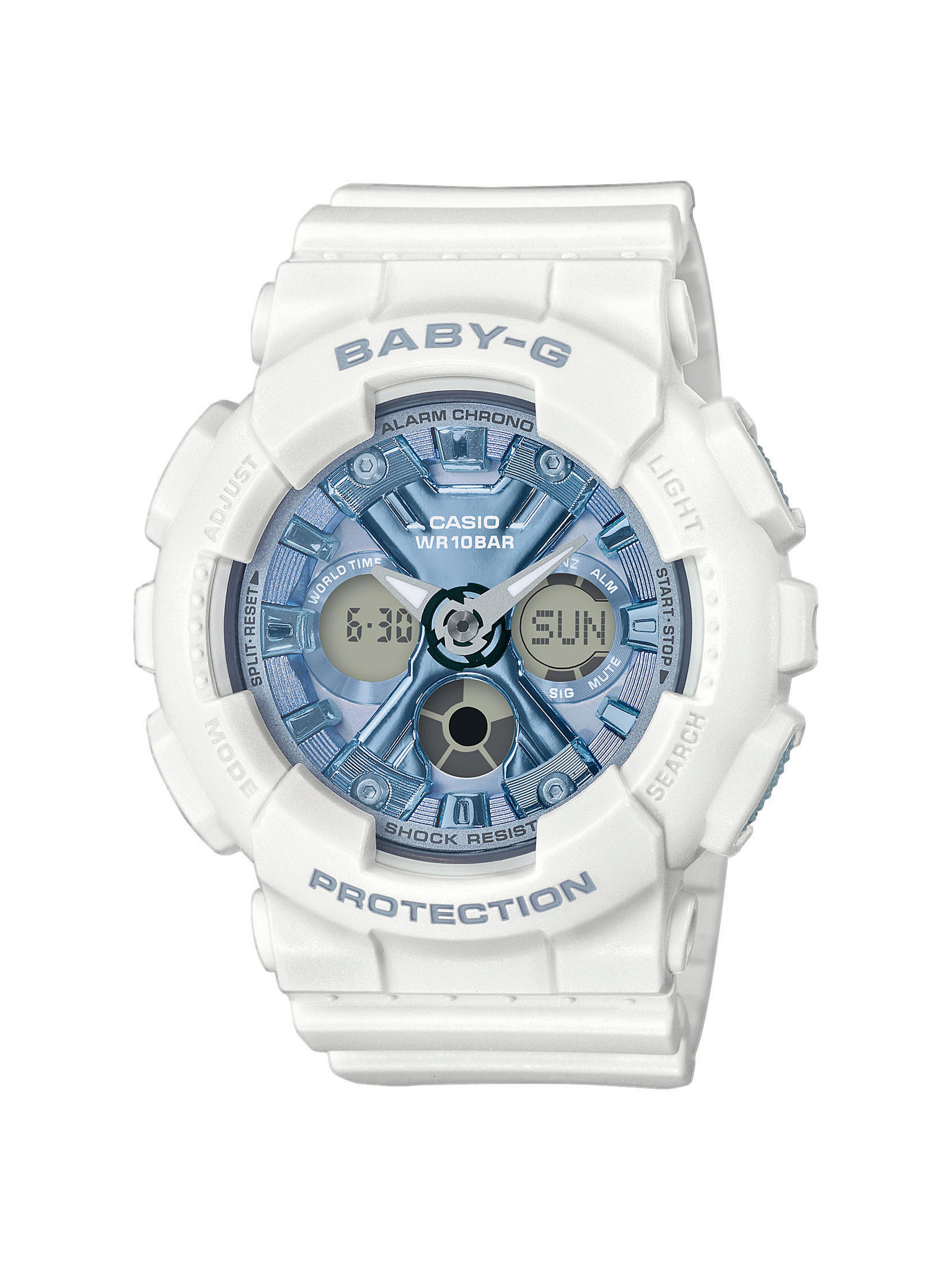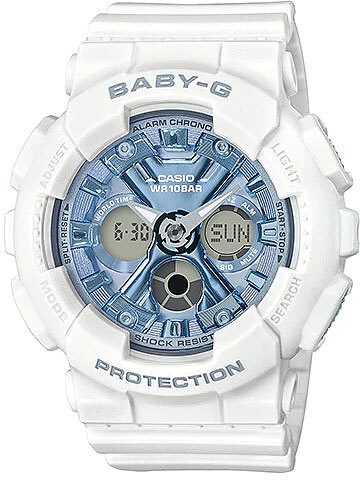Кварцевые часы в пластковом корпусе и браслете, белого цвета. Необритовое светонакопительное покрытие обеспечивает длительное послесвечение в темноте даже после кратковременного нахождения на свету. • Электрическая подсветка - для освещения циферблата используется светодиод. • Отображение текущего времени в основных городах и регионах мира. • Секундомер с точностью показаний 1/100 сек и максимальным временем измерения - 24 час. • Таймер обратного осчета. • 5 ежедневных будильников. • Функция повтора сигнала будильника (Snooze). • Особая ударопрочная конструкция защищает от ударов и вибрации. • Ремешок из полимерного материала.