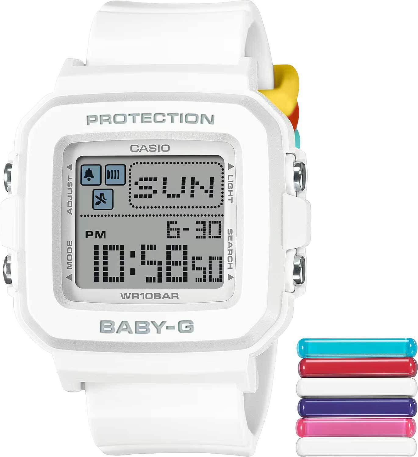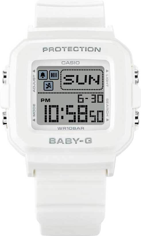Женские кварцевые электронные часы. Коллекция Baby-G+. Противоударный корпус защищает механизм часов от ударов и вибрации. Светодиодная подсветка с функцией послесвечения. Продолжительность свечения 2 секунды. При нажатии кнопки подсветки в режиме текущего времени, на ЖК-дисплее в случайном порядке появляется серия пиксельных анимаций (серфер, танцор, дельфин, иглобрюхая рыба, собака, кошка). Секундомер с точностью показаний 1/100 с и временем измерения 24 часа. Режимы измерения: прошедшее время, промежуточное время, два финишных результата. Таймер обратного отсчета от 1 с до 24 часов с автоповтором. 12-ти и 24-х часовой формат отображения времени. 5 ежедневных будильников, почасовой сигнал времени. Мировое время: 29 часовых поясов (30 городов), включение/отключение летнего времени. Автоматический календарь до 2099 г. Включение/выключение звука кнопок. Прямоугольный корпус из полимерного пластика белого цвета. Размер корпуса 39 мм на 42,8 мм , толщина 14,7 мм. Белый пластиковый сплошной ремешок с классической застежкой. Минеральное стекло устойчивое к мелким механическим повреждениям. В комплекте сменные разноцветные петли для ремешка. Водостойкость WR 100 (плавание и ныряние без акваланга). Вес примерно 34 г.