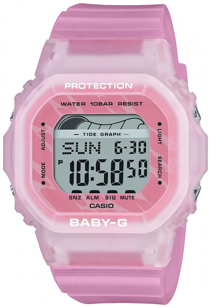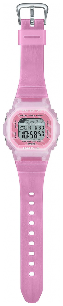 Женские японские наручные часы Casio Baby-G. Благодаря электролюминесцентной панели, которая освещает циферблат, облегчается считывание данных, функция послесвечения - несколько секунд после того, как Вы нажали на кнопку подсветки, подсветка работает. Отображение времени в формате 12/24. Часы отображают текущее время по всему миру (29 временных зон). Автоматический переход на зимнее и летнее время. Возможность включения и отключения данной функции. Яхт-таймер - после каждой пройденной минуты издается звуковой сигнал, в течение последних 10 секунд сигнал издается каждую секунду. Таймер с автоматическим повтором для поклонников точности поможет Вам напомнить о текущих событиях. Часы – хронограф с секундомером. Секундомер с точностью в 1/100 секунды, предел измерения 24 часа. Автоматический календарь. 5 независимых будильников, ежечасный сигнал, 1 с функцией повтора (Snooze). Функция мультисигнала позволяет устанавливать 4 типа сигнала: 1. Ежедневный. 2. Ежемесячный. 3. Сигнал в определенное время каждый день определенного месяца. 4. Сигнал в определенное время в определенный день (на дату). Графическое отображение сведений о приливах и отливах на заданную дату и время. Отображение возраста и фазы Луны. Световая индикация сигнала. Ударопрочная конструкция защитит от ударов и вибрации. Прочное, устойчивое к царапинам минеральное стекло обеспечит защиту часов от повреждений. Высокая водонепроницаемость часов, 200WR (20 Бар) идеально подходит для ныряния без акваланга. Корпус сделан из полимерного пластика. Браслет сделан из полимерного натурального материала, который отличается своей чрезвычайной прочностью и гибкостью. Срок службы 1 аккумулятора до 2 лет. Если Вы яркие, стильные и спортивные, то эти часы для Вас. Доставьте себе удовольствие.