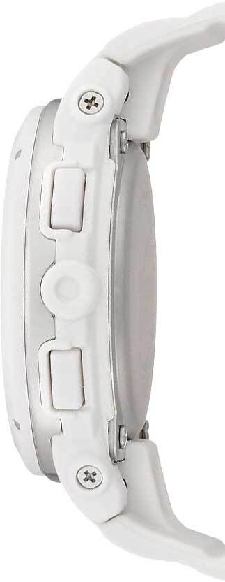 Женские кварцевые аналого-цифровые наручные часы. Коллекция Casio Baby-G. Ударопрочная конструкция защищает механизм часов от ударов и вибрации. Циферблат подсвечивается светодиодом с функцией послесвечения. Настраиваемое послесвечение 1,5 или 3с. Необритовое светонакопительное покрытие стрелок обеспечивает длительное послесвечение в темноте даже после кратковременного воздействия света. Мировое время: 29 часовых поясов (27 городов), время по Гринвичу (GMT), включение/отключение летнего времени. Секундомер с точностью показаний 1/100 секунды и временем измерения 1 ч. Режимы измерения: прошедшее время, промежуточное время, два финишных результата. Таймер обратного отсчета от 1 минуты до 60 мин (с интервалом 1 мин) с автоповтором. 5 ежедневных независимых будильников (один с функцией повтора сигнала snooze), ежечасный сигнал. Автоматический календарь до 2039 года. 12/24х часовой формат отображения времени. Белый циферблат с часовыми метками в виде арабских цифр. Устойчивое к мелким механическим повреждениям минеральное стекло. Круглый корпус из полимерного пластика белого цвета. Размеры корпуса 42,8 мм на 47,5мм, толщина 12,8мм Белый пластиковый ремешок с классической застёжкой buckle. Батарейка рассчитана на 3 года. Водонепроницаемость 100WR (плавание и ныряние без акваланга). Вес около 43 г.