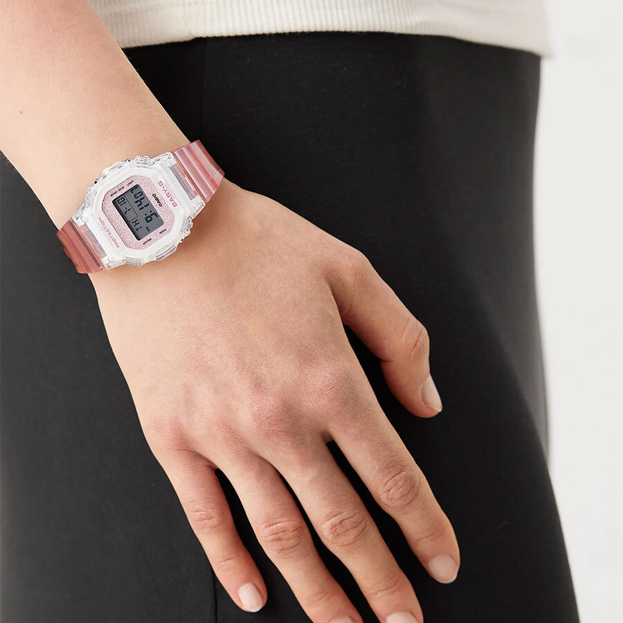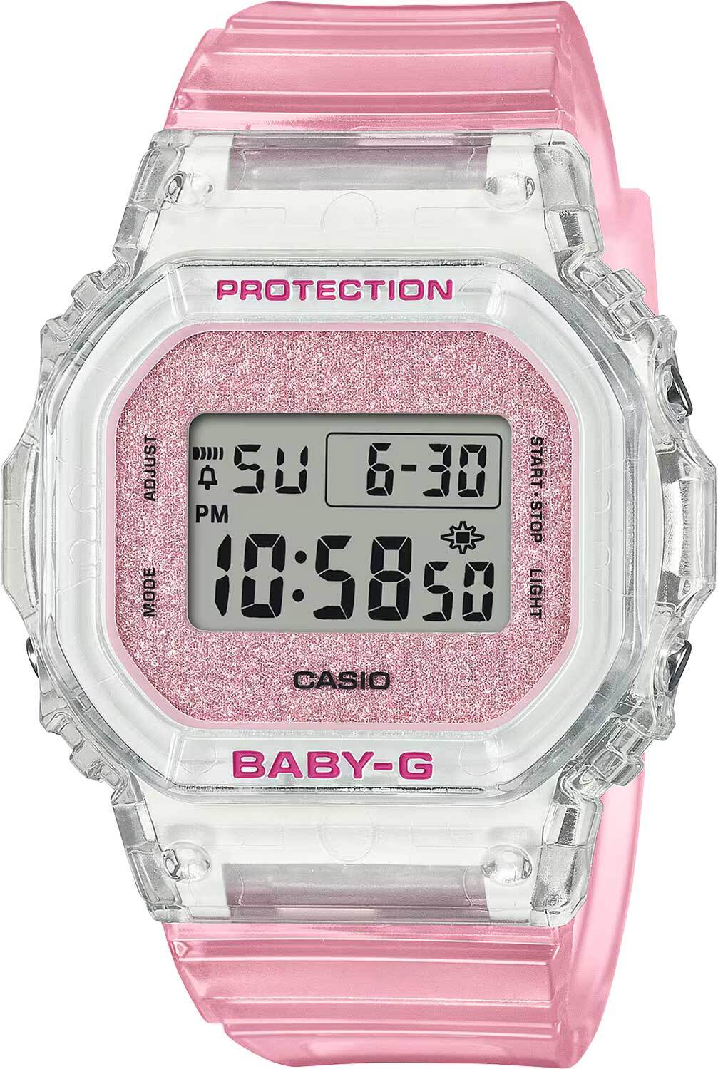 Женские кварцевые часы с цифровой индикацией времени. Коллекция Baby-G. Противоударный корпус защищает механизм часов от ударов и вибрации. Светодиодная подсветка с функцией послесвечения. Световая индикация сигнала (LED-индикатор) - светодиодная лампочка мигает при сигнале будильника, окончании таймера обратного отсчета или секундомера. Секундомер с точностью показаний 1/100 секунды (первый час), 1 секунда (через 1 час) и временем измерения 24 часа. Режимы измерения: прошедшее время, промежуточное время, два финишных результата. Таймер обратного отсчета от 1 минуты до 24 часов (с интервалом в 1 минуту) с автоповтором. Продолжительность сигнала окончания работы таймера 10 секунд. 12-ти и 24-х часовой формат отображения времени. Будильник с многофункциональными звуковыми сигналами, ежечасный сигнал. Автоматический календарь до 2099 г. Прямоугольный корпус из полупрозрачного полимерного пластика белого цвета. Размер корпуса 42,1 мм на 37,9 мм, толщина 11,3 мм. Минеральное стекло устойчивое к мелким механическим повреждениям. Ремешок из полупрозрачного полимерного пластика розового цвета, стандартная застежка buckle. Батарея рассчитана на 3 года. Стальная задняя крышка. Водонепроницаемость WR100 (часы подходят для плавания с маской и трубкой, обычного плавания). Вес около 30 г.