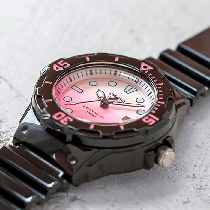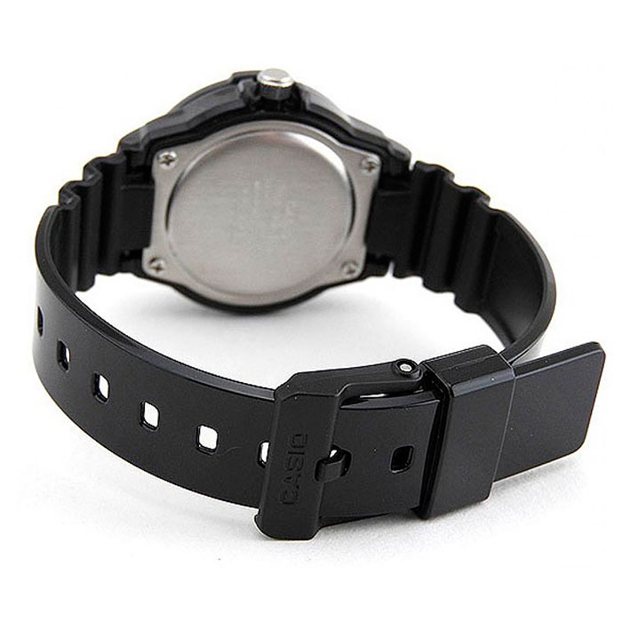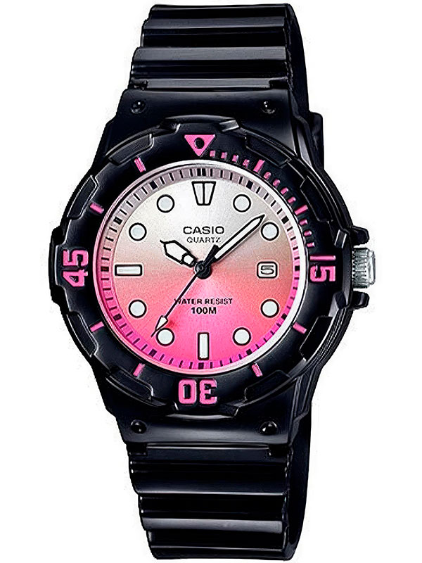 Женские кварцевые наручные часы с аналоговым отображением времени. Серия Casio Collection. Стильная и практичная модель для повседневного использования и активного отдыха. Компактный корпус и лаконичный дизайн делают часы универсальным аксессуаром для любого образа. Центральные часовая, минутная и секундная стрелки. Циферблат с часовыми метками в виде точек и штрихов. Стрелки и часовые метки с люминесцентным покрытием, которое светится в темноте после непродолжительного воздействия света. Индикация даты в позиции 3 часов. Пластиковое стекло. Круглый корпус из полимерного пластика чёрного цвета. Размеры корпуса 34,2 мм на 38,9мм, толщина 11,5мм. Вращающийся безель с минутной шкалой. Переводная головка с защитой. Чё1рный пластиковый ремешок с классической застёжкой buckle. Батарейка рассчитана на 3 года. Водонепроницаемость 100WR (часы подходят для плавания с маской, трубкой, обычного плавания). Вес около 25 г.