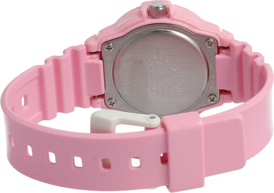 Женские кварцевые наручные часы с аналоговым отображением времени. Серия Casio Collection. Яркие часы в спортивном стиле для активного отдыха и повседневного использования. Центральные часовая, минутная и секундная стрелки. Розовый циферблат с часовыми метками в виде штрихов. Стрелки с люминесцентным покрытием, которое светится в темноте после непродолжительного воздействия света. Индикация даты в позиции 3 часов. Пластиковое стекло. Круглый корпус из полимерного пластика розового цвета. Размеры корпуса 34,2 мм на 38,9мм, толщина 11,5мм. Вращающийся безель с минутной шкалой. Переводная головка с защитой. Розовый пластиковый ремешок с классической застёжкой buckle. Батарейка рассчитана на 3 года. Водонепроницаемость 100WR (часы подходят для плавания с маской, трубкой, обычного плавания). Вес около 25 г.
