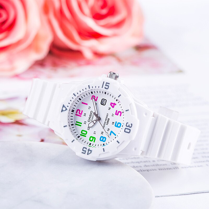 Женские кварцевые наручные часы с аналоговым отображением времени. Серия Casio Collection. Стильная и практичная модель для повседневного использования и активного отдыха. Компактный корпус и лаконичный дизайн делают часы универсальным аксессуаром для любого образа. Центральные часовая, минутная и секундная стрелки. Белый циферблат с часовыми метками в виде разноцветных арабских цифр. Стрелки с люминесцентным покрытием, которое светится в темноте после непродолжительного воздействия света. Индикация даты в позиции 3 часов. 24-х часовая шкала на циферблате. Пластиковое стекло. Круглый корпус из полимерного пластика белого цвета. Размеры корпуса 34,2 мм на 38,9мм, толщина 11,5мм. Вращающийся безель с минутной шкалой. Переводная головка с защитой. Белый пластиковый ремешок с классической застёжкой buckle. Батарейка рассчитана на 3 года. Водонепроницаемость 100WR (часы подходят для плавания с маской, трубкой, обычного плавания). Вес около 25 г.