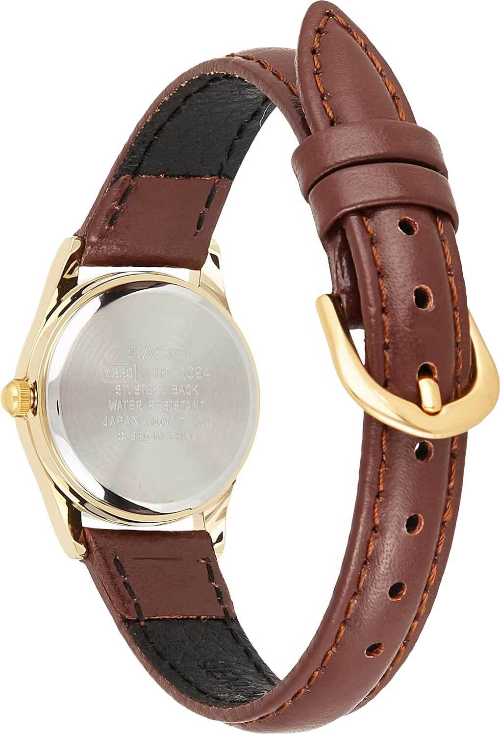 Женские кварцевые аналоговые наручные часы. Серия Casio Collection. Центральные часовая, минутная и секундная стрелки. Белый циферблат с часовыми метками в виде арабских цифр. Циферблат украшен изображением дельфинов. Круглый корпус из нержавеющей стали с IP покрытием цвета жёлтого золота. Размеры корпуса 25 мм на 20 мм, толщина 9.2 мм. Рифлёная переводная. Устойчивое к мелким механическим повреждениям минеральное стекло. Коричневый кожаный ремешок с классической застёжкой buckle. Батарейка рассчитана на 3 года. Водонепроницаемость 30WR (защита от брызг). Вес около 24 г.